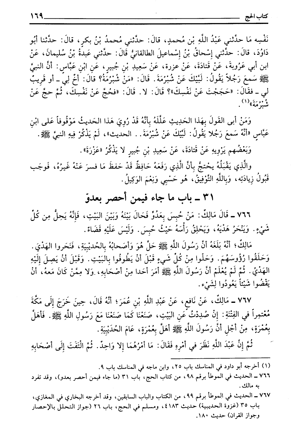 766 - قَالَ مَالِكٌ مَنْ حُبِسَ بِعَدُوٍّ فَحَالَ بَيْنَهُ وَبَيْنَ الْبَيْتِ فَإِنَّهُ يَحِلُّ مِنْ كُلِّ شَيْءٍ وَيَنْحَرُ هَدْيَهُ وَيَحْلِقُ رَأْسَهُ حَيْثُ حُبِسَ وَلَيْسَ عَلَيْهِ قَضَاءٌ