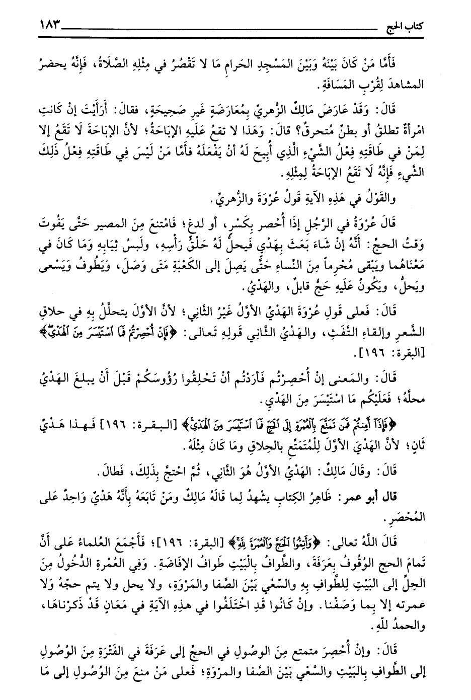 قَالَ اللَّهُ تَعَالَى (وَأَتِمُّوا الْحَجَّ وَالْعُمْرَةَ لِلَّهِ) الْبَقَرَةِ 196 فَأَجْمَعَ الْعُلَمَاءُ عَلَى أَنَّ تَمَامَ الْحَجِّ الْوُقُوفُ بِعَرَفَةَ وَالطَّوَافُ بِالْبَيْتِ طَوَافَ الْإِفَاضَةِ وَفِي الْعُمْرَةِ الدُّخُولُ مِنَ الْحِلِّ إِلَى الْبَيْتِ لِلطَّوَافِ بِهِ وَالسَّعْيِ بَيْنَ الصَّفَا وَالْمَرْوَةِ وَلَا يَحِلُّ وَلَا يَتِمُّ حَجُّهُ وَلَا عُمْرَتُهُ إِلَّا بِمَا وَصَفْنَا وَإِنْ كَانُوا قَدِ اخْتَلَفُوا فِي هَذِهِ الْآيَةِ فِي مَعَانٍ قَدْ ذَكَرْنَاهَا وَالْحَمْدُ لِلَّهِ