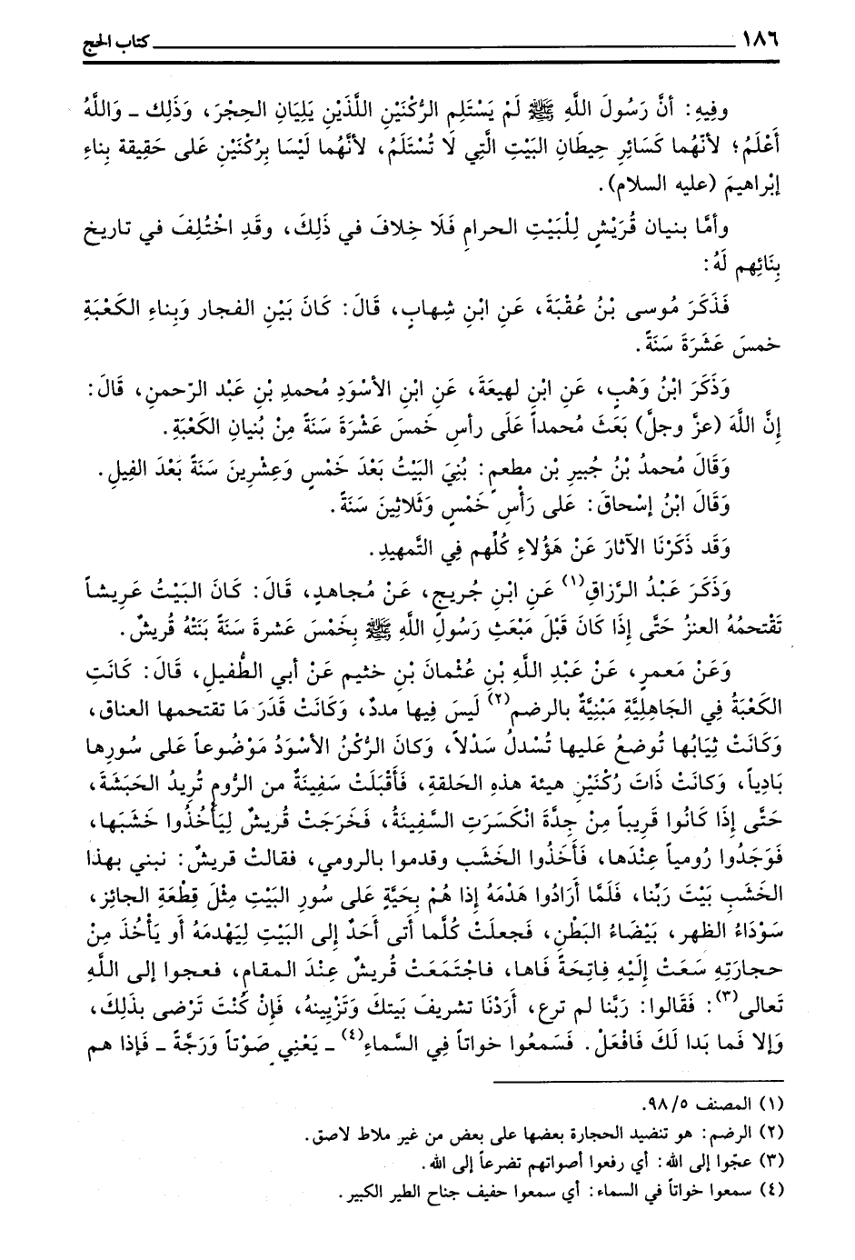 وَعَنْ مَعْمَرٍ عَنْ عَبْدُ اللَّهِ بْنُ عُثْمَانَ بْنِ خُثَيْمٍ عَنْ أَبِي الطُّفَيْلِ قَالَ كَانَتِ الْكَعْبَةُ فِي الْجَاهِلِيَّةِ مَبْنِيَّةً بِالرَّضْمِ لَيْسَ فِيهَا مَدَدٌ وَكَانَتْ قَدْرَ مَا تَقْتَحِمُهَا الْعَنَاقُ وَكَانَتْ ثِيَابُهَا تُوضَعُ عَلَيْهَا تُسْدَلُ سَدْلًا وَكَانَ الرُّكْنُ الْأَسْوَدُ مَوْضُوعًا عَلَى سُورِهَا بَادِيًا وَكَانَتْ ذَاتَ رُكْنَيْنِ هَيْئَةَ هَذِهِ الْحَلْقَةِ فَأَقْبَلَتْ سَفِينَةٌ مِنَ الرُّومِ تُرِيدُ الْحَبَشَةُ حَتَّى إِذَا كَانُوا قَرِيبًا مِنْ جِدَّةَ انْكَسَرَتِ السَّفِينَةُ فَخَرَجَتْ قُرَيْشٌ لِيَأْخُذُوا خَشَبَهَا فَوَجَدُوا رُومِيًّا عِنْدَهَا فَأَخَذُوا الْخَشَبَ وَقَدِمُوا بِالرُّومِيِّ فَقَالَتْ قُرَيْشٌ نَبْنِي بِهَذَا الْخَشَبِ بَيْتَ رَبِّنَا فَلَمَّا أَرَادُوا هَدْمَهُ إِذَا هُمْ بِحَيَّةٍ عَلَى سُورِ الْبَيْتِ مِثْلَ قِطْعَةِ الْجَائِزِ سَوْدَاءُ الظَّهْرِ بَيْضَاءُ الْبَطْنِ فَجَعَلَتْ كُلَّمَا أَتَى أَحَدٌ إِلَى الْبَيْتِ لِيَهْدِمَهُ أَوْ يَأْخُذَ مِنْ حِجَارَتِهِ سَعَتْ إِلَيْهِ فَاتِحَةً فَاهَا فَاجْتَمَعَتْ قُرَيْشٌ عِنْدَ الْمَقَامِ فَعَجُّوا إِلَى اللَّهِ تَعَالَى فَقَالُوا رَبَّنَا لَمْ تَرْعَ أردنا تشريف بيتك وتزيينه فَإِنْ كُنْتَ تَرْضَى بِذَلِكَ وَإِلَّا فَمَا بَدَا لَكَ فَافْعَلْ فَسَمِعُوا خَوَاتًا فِي السَّمَاءِ يَعْنِي صَوْتًا وَرَجَّةً فَإِذَا هُمْ