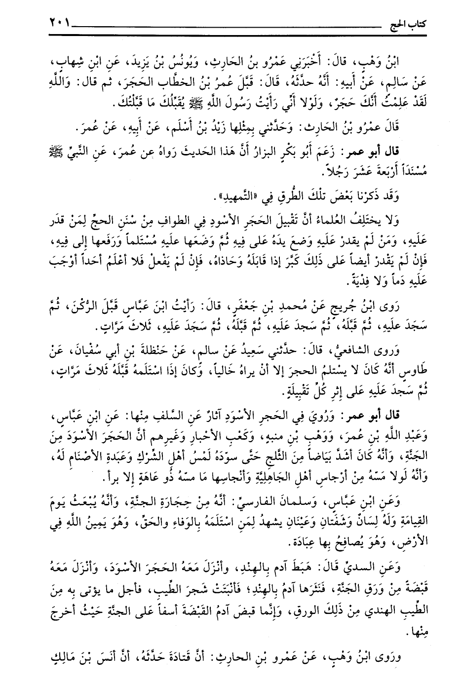 قَالَ أَبُو عُمَرَ وَرُوِيَ فِي الْحَجَرِ الْأَسْوَدِ آثَارٌ عَنِ السلف منها عن بن عَبَّاسٍ وَعَبْدِ اللَّهِ بْنِ عُمَرَ وَوَهْبِ بْنِ مُنَبِّهٍ وَكَعْبِ الْأَحْبَارِ وَغَيْرِهِمْ أَنَّ الْحَجَرَ الْأَسْوَدَ مِنَ الْجَنَّةِ وَأَنَّهُ كَانَ أَشَدَّ بَيَاضًا مِنَ الثَّلْجِ حَتَّى سَوَّدَهُ لَمْسُ أَهْلِ الشِّرْكِ وَعَبَدَةِ الْأَصْنَامِ لَهُ وَإِنَّهُ لَوْلَا مَسُّهُ مِنْ أَرْجَاسِ أَهْلِ الْجَاهِلِيَّةِ وَأَنْجَاسِهَا مَا مَسَّهُ ذُو عَاهَةٍ إلا برأ