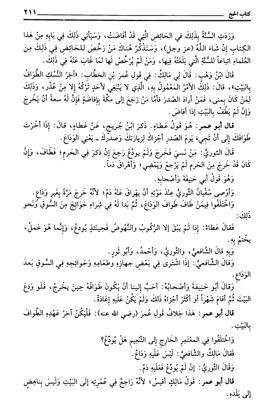 وَرَدَتِ السُّنَّةُ بِذَلِكَ فِي الْحَائِضِ الَّتِي قَدْ أَفَاضَتْ وَسَيَأْتِي ذَلِكَ فِي بَابِهِ مِنْ هَذَا الْكِتَابِ إِنْ شَاءَ اللَّهُ (عَزَّ وَجَلَّ) وَسَنَذْكُرُ هُنَاكَ مَنْ رَخَّصَ لِلْحَائِضِ فِي ذَلِكَ مِنَ الْعُلَمَاءِ اتِّبَاعًا لِلسُّنَّةِ الَّتِي بَلَغَتْهُ فِيهَا وَمَنْ لَمْ يُرَخِّصْ لَهَا لِمَا غَابَ عَنْهُ فِي ذلك