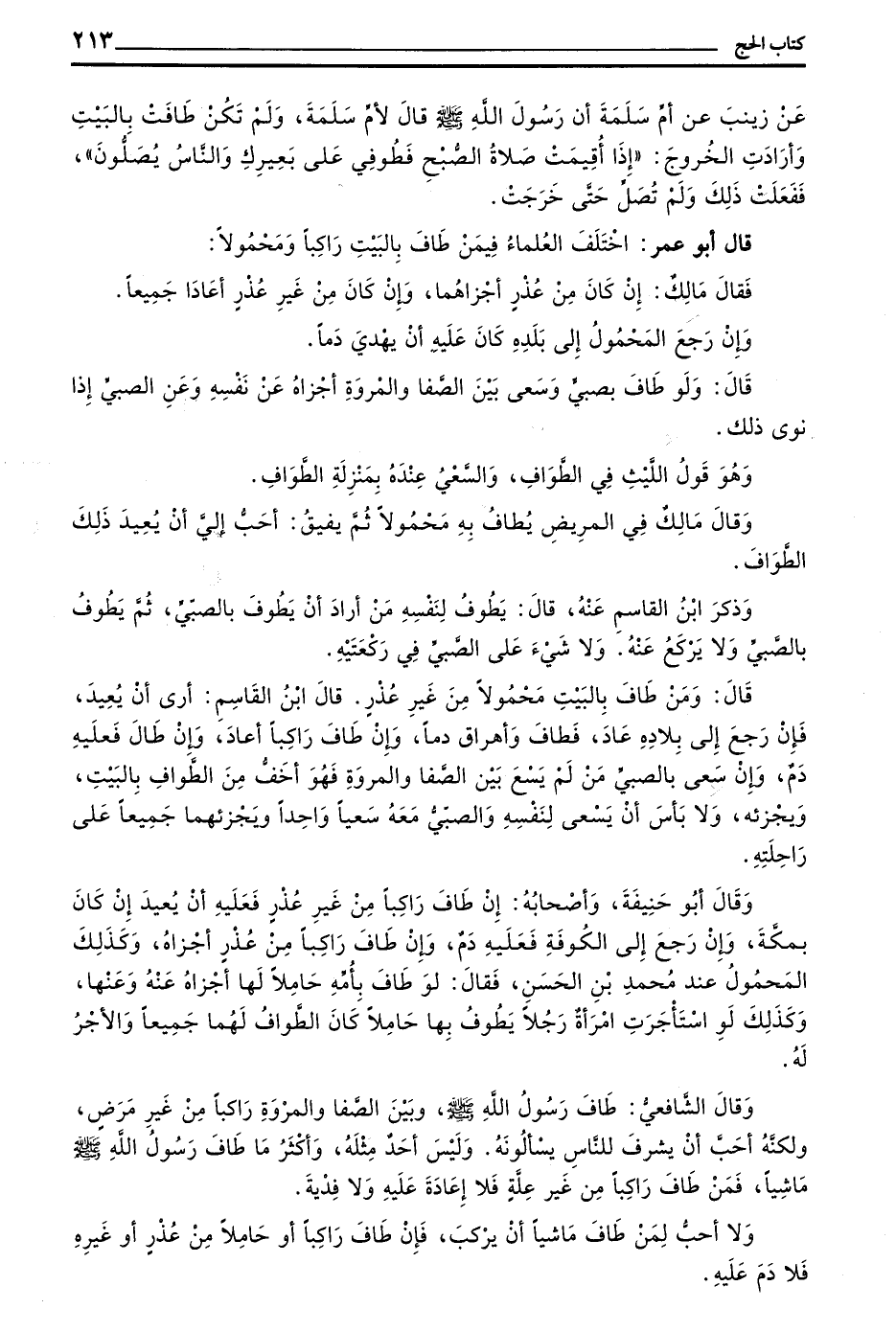 عَنْ زَيْنَبَ عَنْ أُمِّ سَلَمَةَ أَنَّ رَسُولَ اللَّهِ صَلَّى اللَّهُ عَلَيْهِ وَسَلَّمَ قَالَ لِأُمِّ سَلَمَةَ وَلَمْ تَكُنْ طَافَتْ بِالْبَيْتِ وَأَرَادَتِ الْخُرُوجَ إِذَا أُقِيمَتْ صَلَاةُ الصُّبْحِ فَطُوفِي عَلَى بَعِيرِكِ وَالنَّاسُ يُصَلُّونَ فَفَعَلَتْ ذَلِكَ وَلَمْ تُصَلِّ حَتَّى خَرَجَتْ قَالَ أَبُو عُمَرَ اخْتَلَفَ الْعُلَمَاءُ فِيمَنْ طَافَ بِالْبَيْتِ رَاكِبًا وَمَحْمُولًا