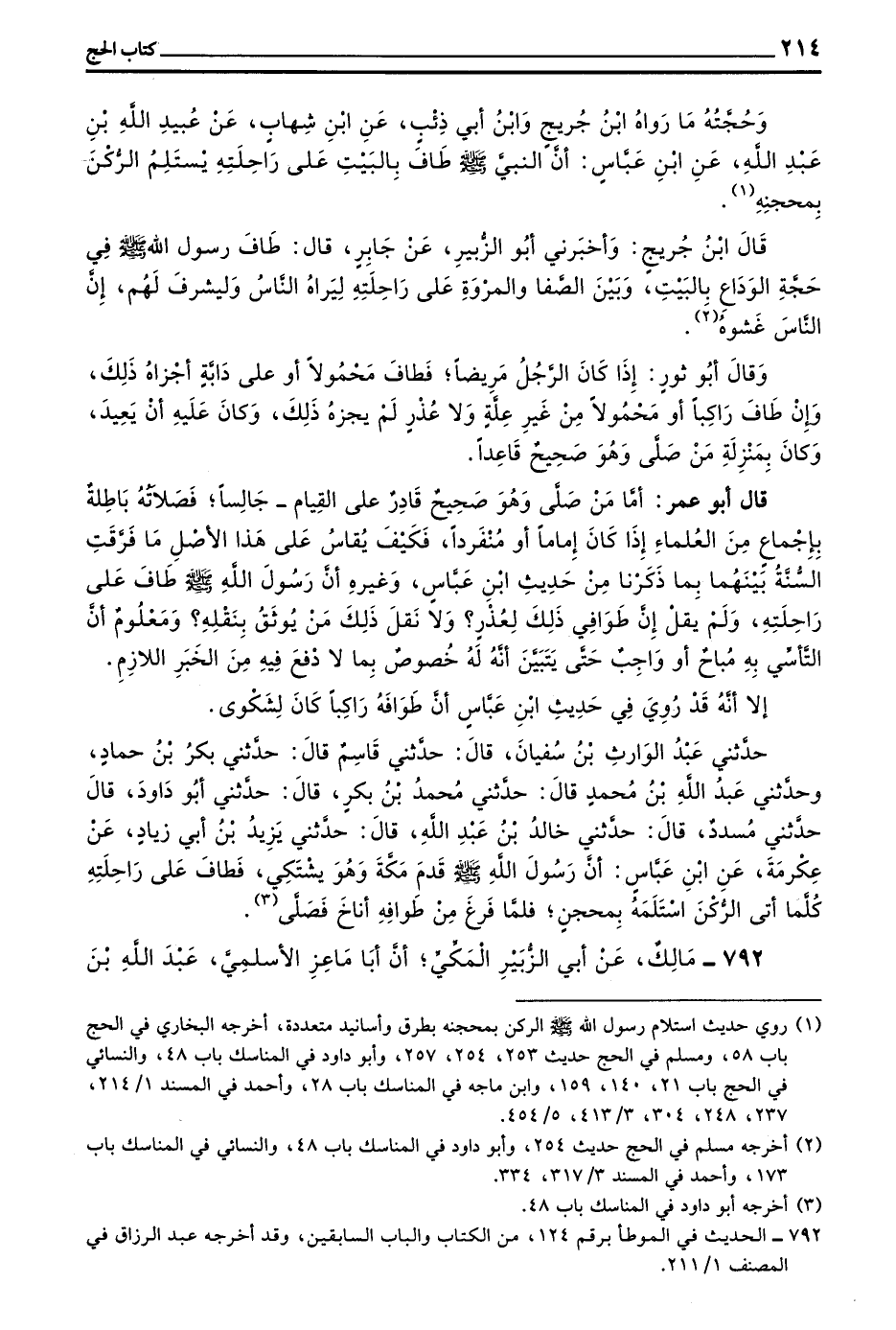وحجته ما رواه بن جريج وبن أبي ذئب عن بن شِهَابٍ عَنْ عُبَيْدِ اللَّهِ بْنِ عَبْدِ اللَّهِ عن بن عَبَّاسٍ أَنَّ النَّبِيَّ صَلَّى اللَّهُ عَلَيْهِ وَسَلَّمَ طَافَ بِالْبَيْتِ عَلَى رَاحِلَتِهِ يَسْتَلِمُ الرُّكْنَ بِمِحْجَنِهِ