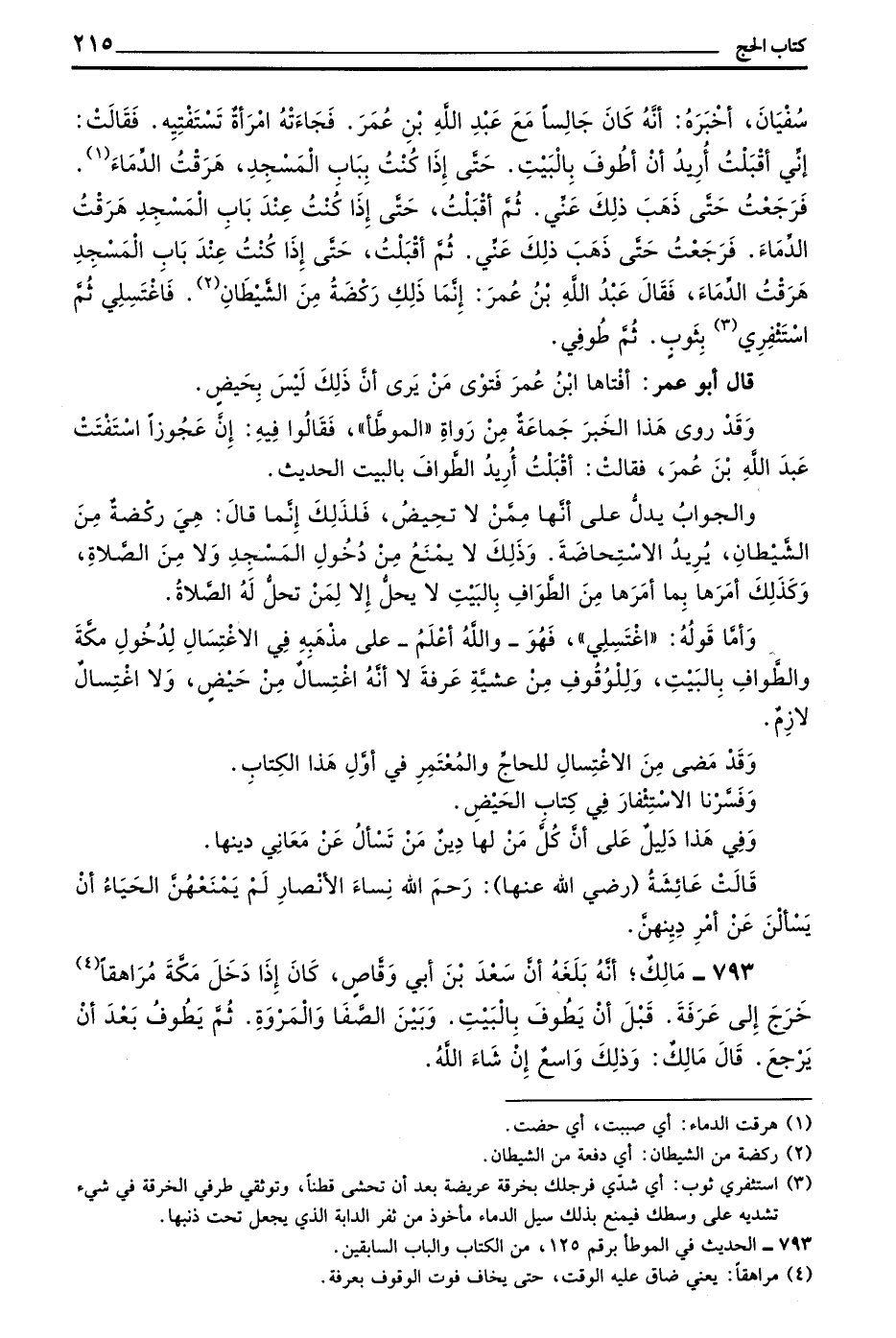 سُفْيَانَ أَخْبَرَهُ أَنَّهُ كَانَ جَالِسًا مَعَ عَبْدِ اللَّهِ بْنِ عُمَرَ فَجَاءَتْهُ امْرَأَةٌ تَسْتَفْتِيهِ فَقَالَتْ إِنِّي أَقْبَلْتُ أُرِيدُ أَنْ أَطُوفَ بِالْبَيْتِ حَتَّى إِذَا كُنْتُ بِبَابِ الْمَسْجِدِ هَرَقْتُ الدِّمَاءَ فَرَجَعْتُ حَتَّى ذَهَبَ ذَلِكَ عَنِّي ثُمَّ أَقْبَلْتُ حَتَّى إِذَا كُنْتُ بِبَابِ الْمَسْجِدِ هَرَقْتُ الدِّمَاءَ فَرَجَعْتُ حَتَّى ذَهَبَ ذَلِكَ عَنِّي ثُمَّ أَقْبَلْتُ حَتَّى إِذَا كُنْتُ عِنْدَ بَابِ الْمَسْجِدِ هَرَقْتُ الدِّمَاءَ فَقَالَ عَبْدُ اللَّهِ بْنُ عُمَرَ إِنَّمَا ذَلِكَ رَكْضَةٌ مِنَ الشَّيْطَانِ فَاغْتَسِلِي ثُمَّ اسْتَثْفِرِي بِثَوْبٍ ثُمَّ طُوفِي