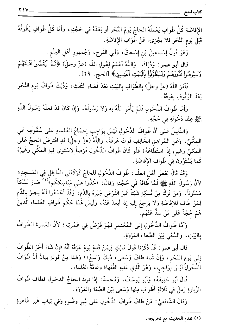 قَالَ أَبُو عُمَرَ قَدْ ذَكَرْنَا قَوْلَ مَالِكٍ فِيمَنْ قَدِمَ يَوْمَ عَرَفَةَ أَنَّهُ إِنْ شَاءَ أَخَّرَ الطَّوَافَ إِلَى يَوْمِ النَّحْرِ وَإِنْ شَاءَ طَافَ وَسَعَى ذَلِكَ وَاسِعٌ وَهَذَا مِنْ قَوْلِهِ بَيَانُ أَنَّ طَوَافَ الدُّخُولِ لَيْسَ بِوَاجِبٍ وَهُوَ الَّذِي عَلَيْهِ الْفُقَهَاءُ وَعَامَّةُ الْعُلَمَاءِ