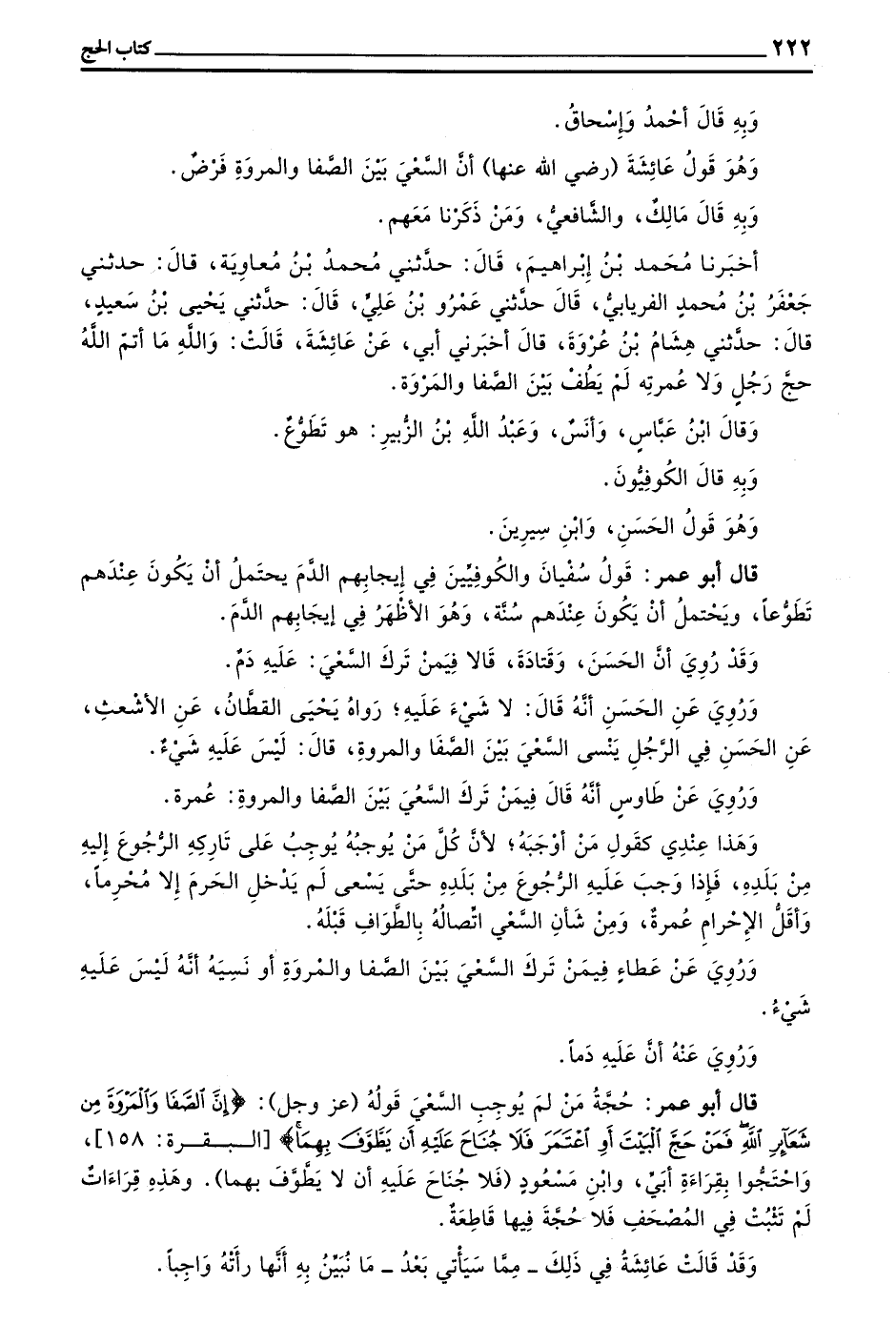 قَالَ أَبُو عُمَرَ حُجَّةُ مَنْ لَمْ يُوجِبْ السَّعْيَ قَوْلُهُ (عَزَّ وَجَلَّ) (إِنَّ الصَّفَا وَالْمَرْوَةَ مِنْ شَعَائِرِ اللَّهِ فَمَنْ حَجَّ الْبَيْتَ أَوِ اعْتَمَرَ فَلَا جُنَاحَ عَلَيْهِ أَنْ يَطَّوَّفَ بِهِمَا) الْبَقَرَةِ 158 واحتجوا بقراءة أبي وبن مَسْعُودٍ (فَلَا جُنَاحَ عَلَيْهِ أَنْ لَا يَطَّوَّفَ بِهِمَا) وَهَذِهِ قِرَاءَاتٌ لَمْ تَثْبُتْ فِي الْمُصْحَفِ فَلَا حُجَّةَ فِيهَا قَاطِعَةٌ