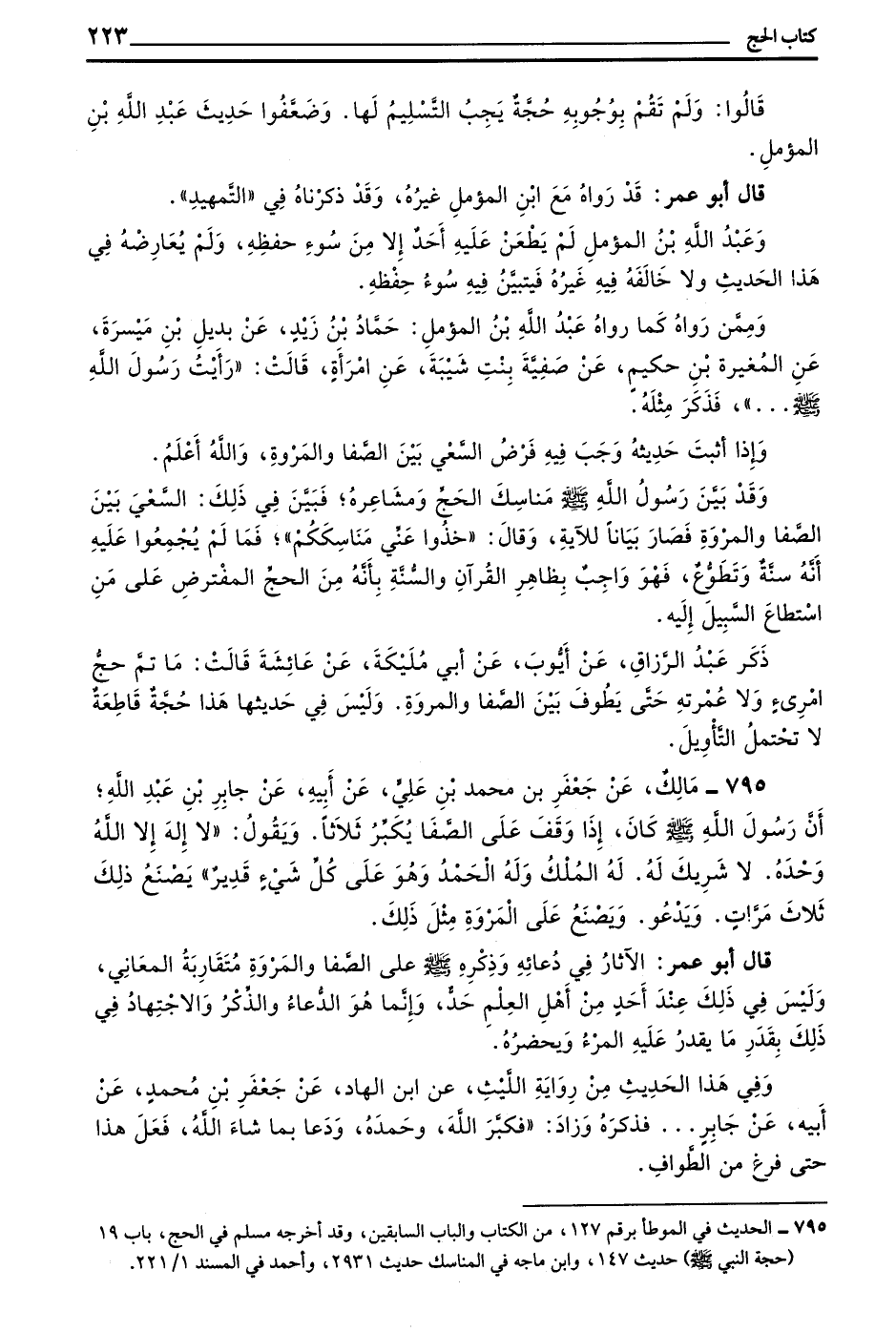 (795 - مَالِكٌ عَنْ جَعْفَرِ بْنِ مُحَمَّدِ بْنِ عَلِيٍّ عَنْ أَبِيهِ عَنْ جَابِرِ بْنِ عَبْدِ اللَّهِ أنَّ رَسُولَ اللَّهِ صَلَّى اللَّهُ عَلَيْهِ وَسَلَّمَ كَانَ إِذَا وَقَفَ عَلَى الصَّفَا يُكَبِّرُ ثَلَاثًا وَيَقُولُ لَا إِلَهَ إِلَّا اللَّهُ وَحْدَهُ لَا شَرِيكَ لَهُ لَهُ الْمُلْكُ وَلَهُ الْحَمْدُ وَهُوَ عَلَى كُلِّ شَيْءٍ قَدِيرٌ يَصْنَعُ ذَلِكَ ثَلَاثَ مَرَّاتٍ وَيَدْعُو وَيَصْنَعُ عَلَى الْمَرْوَةِ مِثْلَ ذَلِكَ)