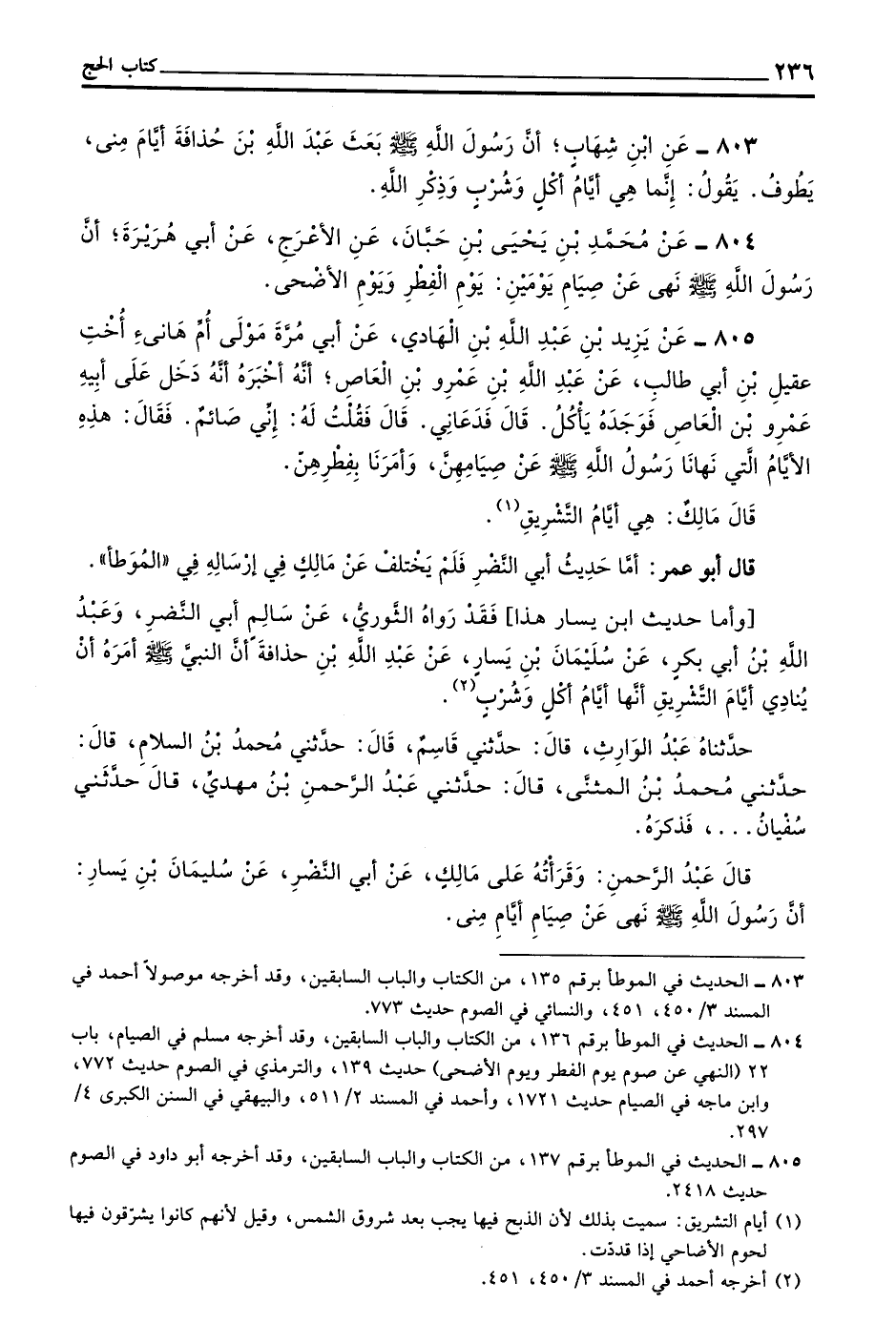 803 - عن بن شِهَابٍ أَنَّ رَسُولَ اللَّهِ صَلَّى اللَّهُ عَلَيْهِ وَسَلَّمَ بَعَثَ عَبْدَ اللَّهِ بْنَ حُذَافَةَ أَيَّامَ مِنًى يَطُوفُ يَقُولُ إِنَّمَا هِيَ أَيَّامُ أَكْلٍ وَشُرْبٍ وَذِكْرِ اللَّهِ