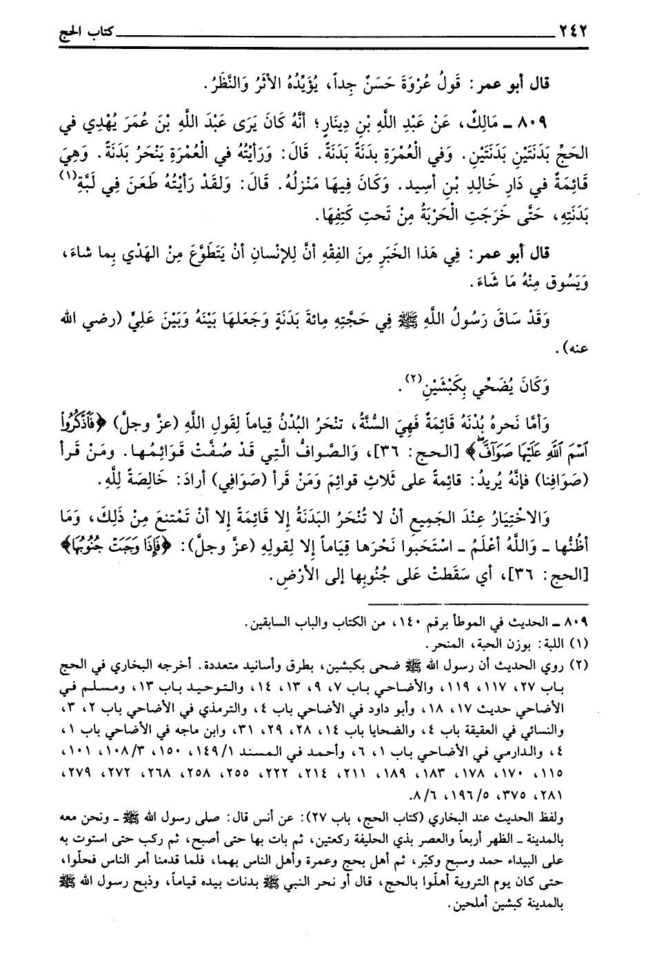 809 - مَالِكٌ عَنْ عَبْدِ اللَّهِ بْنِ دِينَارٍ أَنَّهُ كَانَ يَرَى عَبْدَ اللَّهِ بْنَ عُمَرَ يُهْدِي فِي الْحَجِّ بَدَنَتَيْنِ بَدَنَتَيْنِ وَفِي الْعُمْرَةِ بَدَنَةً بَدَنَةً قَالَ وَرَأَيْتُهُ فِي الْعُمْرَةِ يَنْحَرُ بَدَنَةً وَهِيَ قَائِمَةٌ فِي دَارِ خَالِدِ بْنِ أُسَيْدٍ وَكَانَ فِيهَا مَنْزِلُهُ قَالَ وَلَقَدْ رَأَيْتُهُ طَعَنَ فِي لَبَّةِ بَدَنَتِهِ حَتَّى خَرَجَتِ الْحَرْبَةُ مِنْ تَحْتِ كَتِفِهَا