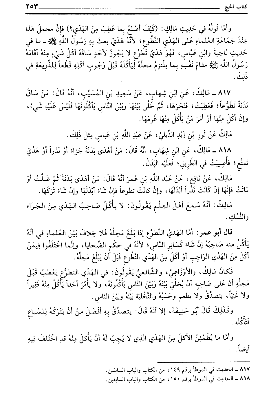 817 - مالك عن بن شِهَابٍ عَنْ سَعِيدِ بْنِ الْمُسَيَّبِ أَنَّهُ قَالَ مَنْ سَاقَ بَدَنَةً تَطَوُّعًا فَعَطِبَتْ فَنَحَرَهَا ثُمَّ خَلَّى بَيْنَهَا وَبَيْنَ النَّاسِ يَأْكُلُونَهَا فَلَيْسَ عَلَيْهِ شَيْءٌ وَإِنْ أَكَلَ مِنْهَا أَوْ أَمَرَ مَنْ يَأْكُلُ مِنْهَا غَرِمَهَا
