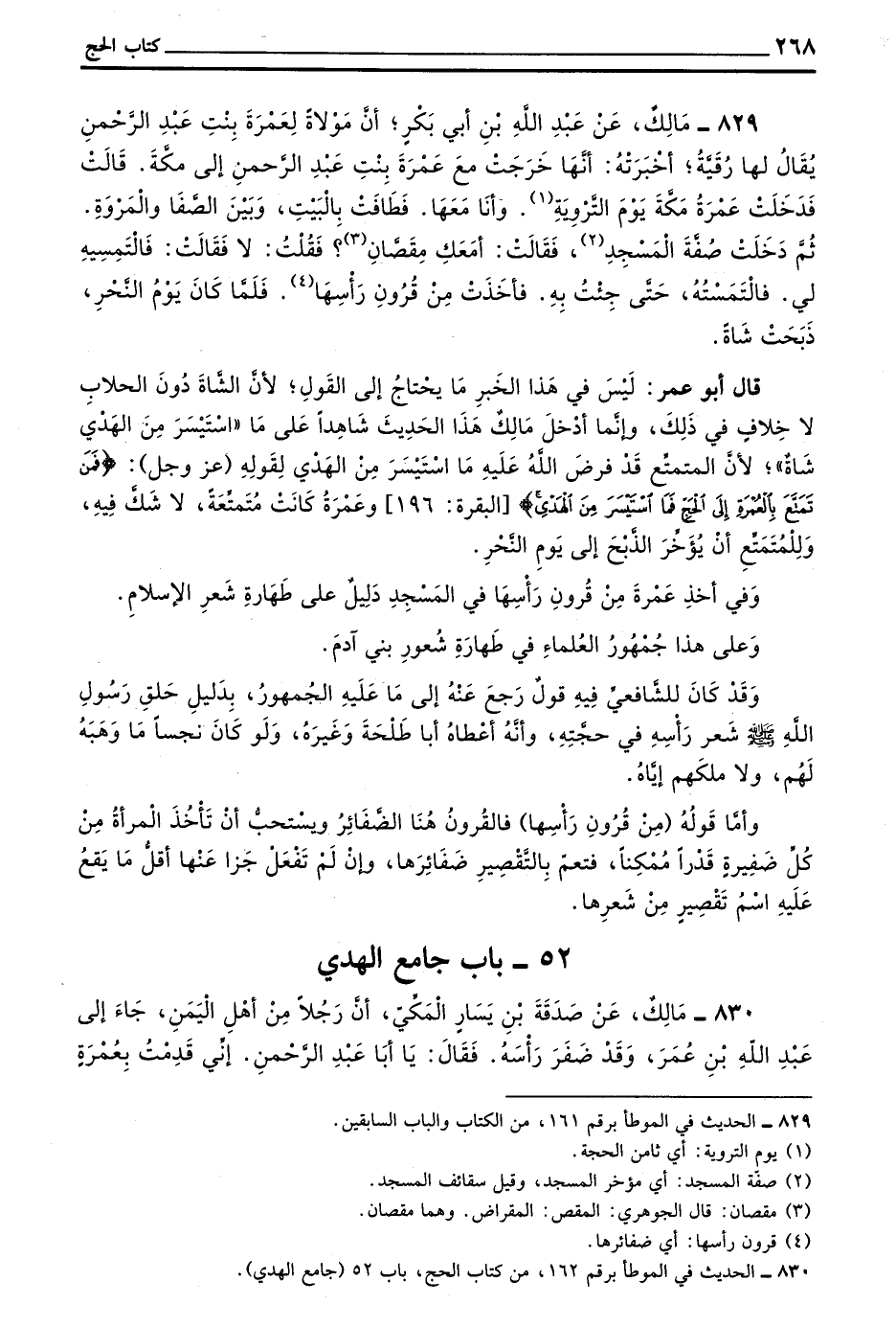 829 - مالك عن عبد الله بن أبي بكر أَنَّ مَوْلَاةً لِعَمْرَةَ بِنْتِ عَبْدِ الرَّحْمَنِ يُقَالُ لَهَا رُقَيَّةُ أَخْبَرَتْهُ أَنَّهَا خَرَجَتْ مَعَ عَمْرَةَ بِنْتِ عَبْدِ الرَّحْمَنِ إِلَى مَكَّةَ قَالَتْ فَدَخَلَتْ عَمْرَةُ مَكَّةَ يَوْمَ التَّرْوِيَةِ وَأَنَا مَعَهَا فَطَافَتْ بِالْبَيْتِ وَبَيْنَ الصَّفَا وَالْمَرْوَةِ ثُمَّ دَخَلَتْ صُفَّةَ الْمَسْجِدِ فَقَالَتْ أَمَعَكِ مِقَصَّانِ فَقُلْتُ لَا فَقَالَتْ فَالْتَمِسِيهِ لِي فَالْتَمَسْتُهُ حَتَّى جِئْتُ بِهِ فَأَخَذَتْ مِنْ قُرُونِ رَأْسِهَا فَلَمَّا كَانَ يَوْمُ النَّحْرِ ذَبَحَتْ شَاةً