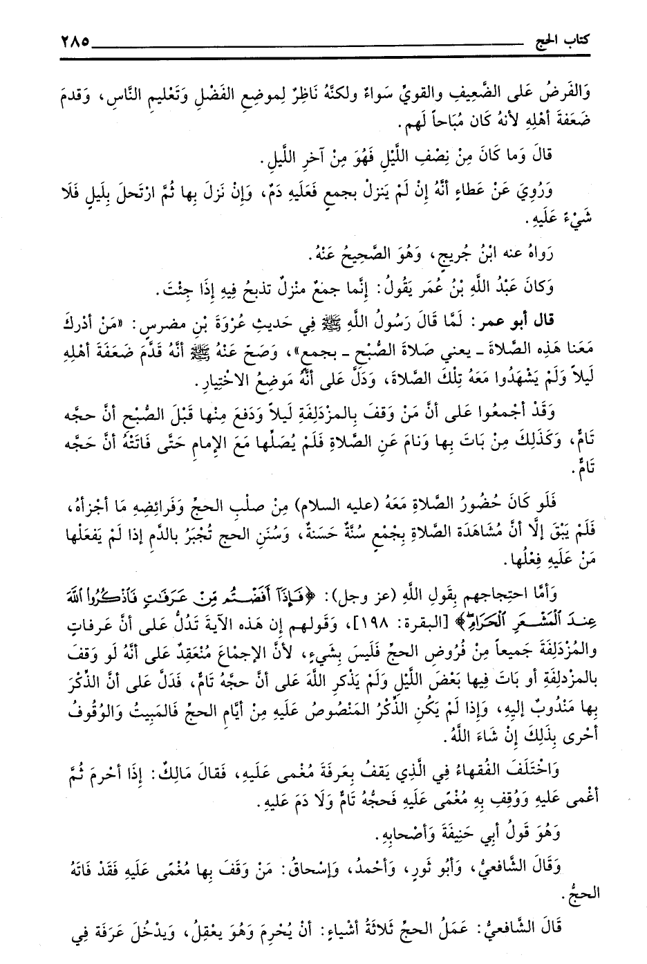 وَأَمَّا احْتِجَاجُهُمْ بِقَوْلِ اللَّهِ (عَزَّ وَجَلَّ) (فَإِذَا أَفَضْتُمْ مِنْ عَرَفَاتٍ فَاذْكُرُوا اللَّهَ عِنْدَ الْمَشْعَرِ الْحَرَامِ) الْبَقَرَةِ 198 وَقَوْلُهُمْ إِنَّ هَذِهِ الْآيَةَ تَدُلُّ عَلَى أَنَّ عَرَفَاتٍ وَالْمُزْدَلِفَةَ جَمِيعًا مِنْ فُرُوضِ الْحَجِّ فَلَيْسَ بِشَيْءٍ لِأَنَّ الْإِجْمَاعَ مُنْعَقِدٌ عَلَى أَنَّهُ لَوْ وَقَفَ بِالْمُزْدَلِفَةِ أَوْ بَاتَ فِيهَا بَعْضَ اللَّيْلِ وَلَمْ يَذْكُرِ اللَّهَ عَلَى أَنَّ حَجَّهُ تَامٌّ فَدَلَّ عَلَى أَنَّ الذِّكْرَ بِهَا مَنْدُوبٌ إِلَيْهِ وَإِذَا لَمْ يَكُنِ الذِّكْرُ الْمَنْصُوصُ عليه من أيام الْحَجِّ فَالْمَبِيتُ وَالْوُقُوفُ أَحْرَى بِذَلِكَ إِنْ شَاءَ اللَّهُ