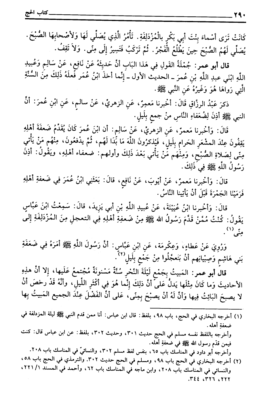 ذَكَرَ عَبْدُ الرَّزَّاقِ قَالَ أَخْبَرَنَا مَعْمَرٌ عن الزهري عن سالم عن بْنِ عُمَرَ أَنَّ النَّبِيَّ صَلَّى اللَّهُ عَلَيْهِ وَسَلَّمَ أَذِنَ لِضُعَفَاءِ النَّاسِ مِنْ جَمْعٍ بِلَيْلٍ