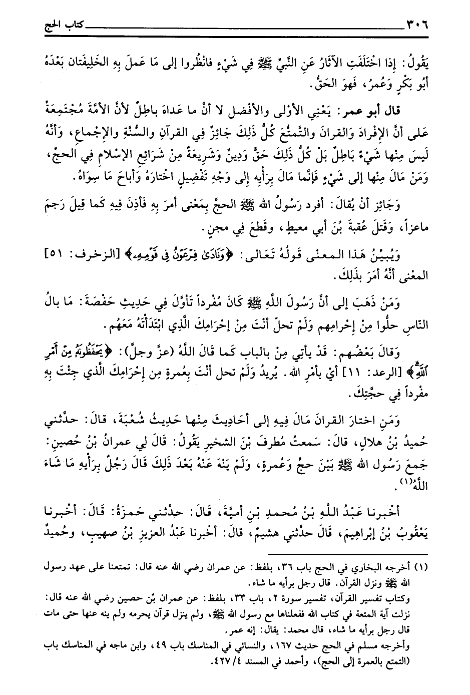وَمَنِ اخْتَارَ الْقِرَانَ مَالَ فِيهِ إِلَى أَحَادِيثَ مِنْهَا حَدِيثُ شُعْبَةَ قَالَ حَدَّثَنِي حُمَيْدُ بْنُ هِلَالٍ قَالَ سَمِعْتُ مُطَرِّفَ بْنَ الشِّخِّيرِ يَقُولُ قَالَ لِي عِمْرَانُ بْنُ حُصَيْنٍ جَمَعَ رَسُولُ اللَّهِ صَلَّى اللَّهُ عَلَيْهِ وَسَلَّمَ بَيْنَ حَجٍّ وَعُمْرَةٍ وَلَمْ يَنْهَ عَنْهُ بَعْدَ ذَلِكَ قَالَ رَجُلٌ بِرَأْيِهِ مَا شَاءَ اللَّهُ