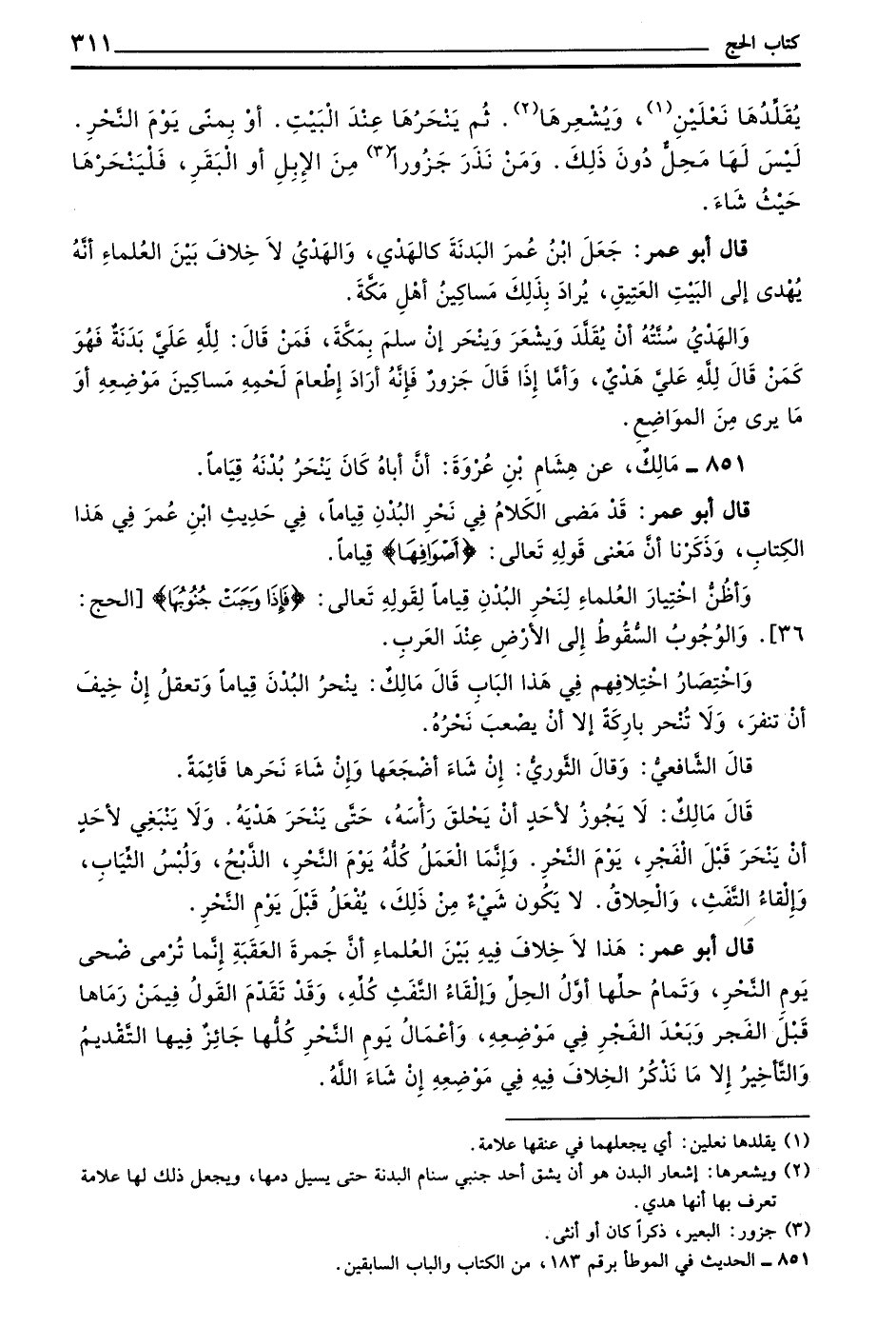 851 - مَالِكٌ عَنْ هِشَامِ بْنِ عُرْوَةَ أَنَّ أَبَاهُ كَانَ يَنْحَرُ بُدْنَهُ قِيَامًا