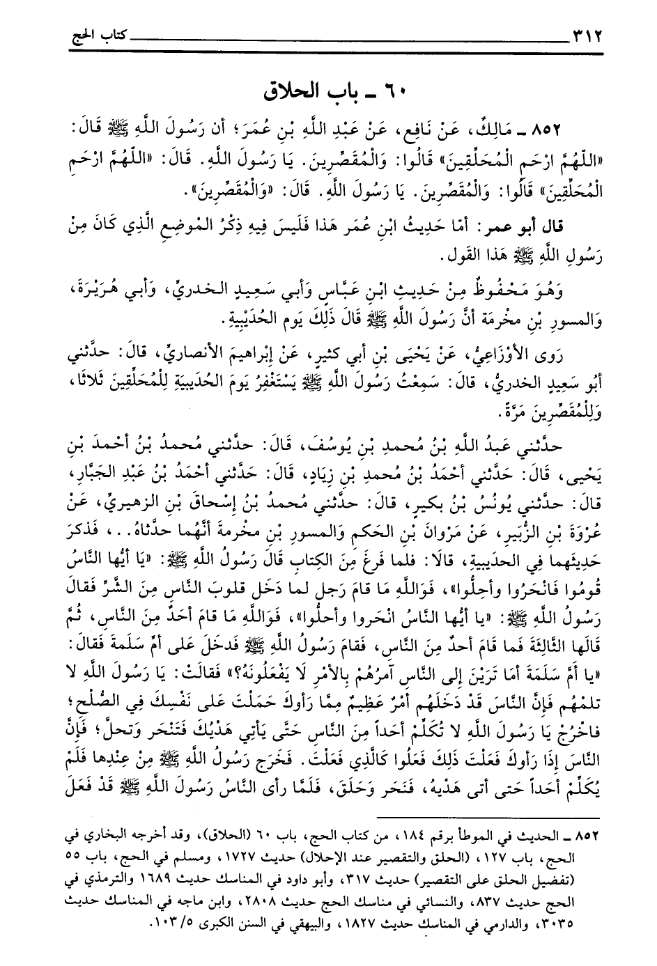 852 - مَالِكٌ عَنْ نَافِعٍ عَنْ عَبْدِ اللَّهِ بْنِ عُمَرَ أَنَّ رَسُولَ اللَّهِ صَلَّى اللَّهُ عَلَيْهِ وَسَلَّمَ قَالَ اللَّهُمَّ ارْحَمِ الْمُحَلِّقِينَ قَالُوا وَالْمُقَصِّرِينَ يَا رَسُولَ اللَّهِ قَالَ اللَّهُمَّ ارْحَمِ الْمُحَلِّقِينَ قَالُوا وَالْمُقَصِّرِينَ يَا رَسُولَ اللَّهِ قَالَ وَالْمُقَصِّرِينَ