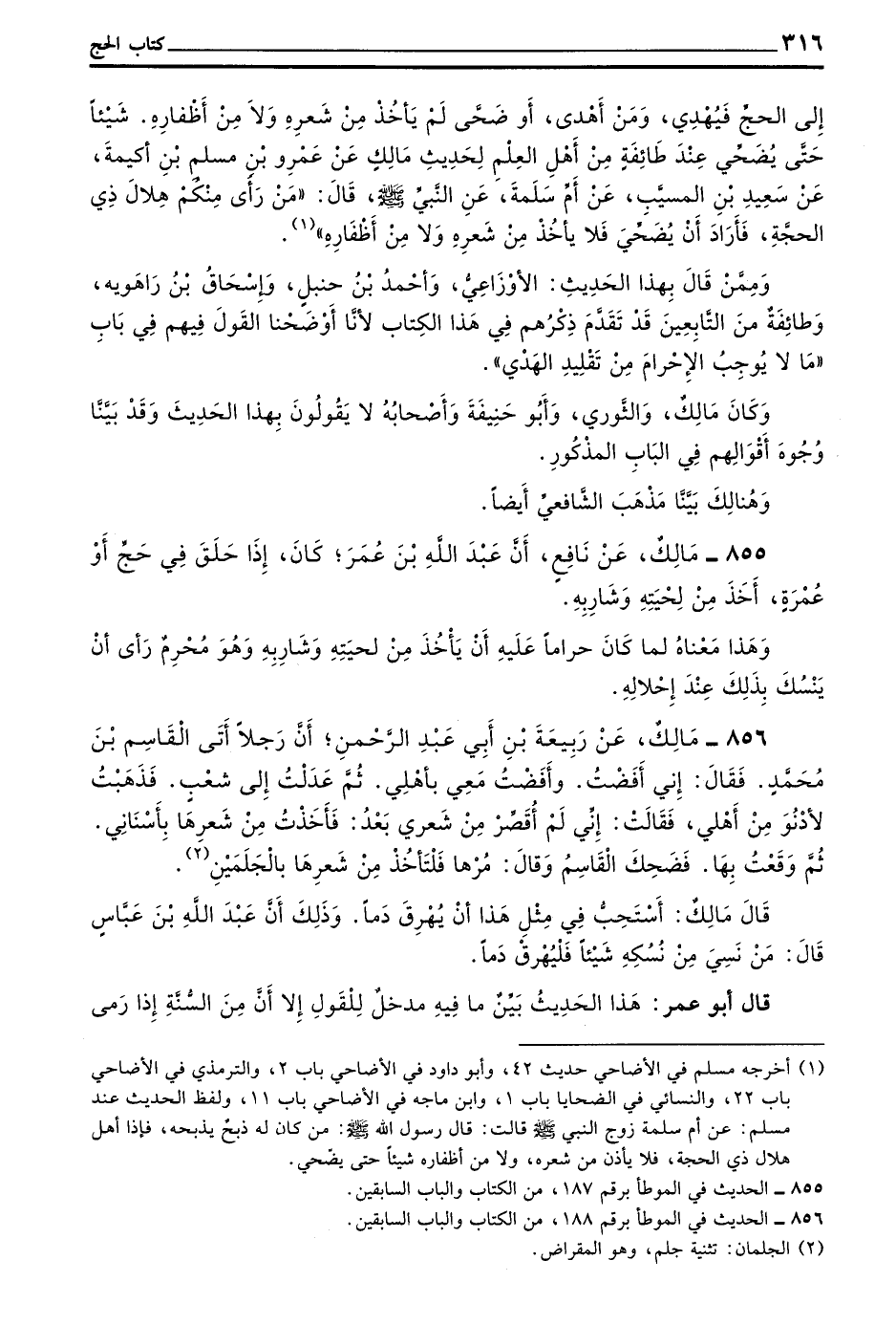 إِلَى الْحَجِّ فَيُهْدِي وَمَنْ أَهْدَى أَوْ ضَحَّى لَمْ يَأْخُذْ مِنْ شَعْرِهِ وَلَا مِنْ أَظْفَارِهِ شَيْئًا حَتَّى يُضَحِّيَ عِنْدَ طَائِفَةٍ مِنْ أَهْلِ الْعِلْمِ لِحَدِيثِ مَالِكٍ عَنْ عَمْرِو بْنِ مُسْلِمٍ بْنِ أُكَيْمَةَ عَنْ سَعِيدِ بْنِ الْمُسَيَّبِ عَنْ أَمِّ سَلَمَةَ عَنِ النَّبِيِّ صَلَّى اللَّهُ عَلَيْهِ وَسَلَّمَ قَالَ مَنْ رَأَى مِنْكُمْ هِلَالَ ذِي الحجة فأراد أن يضحي فلا يأخذ من شَعْرِهِ وَلَا مِنْ أَظْفَارِهِ