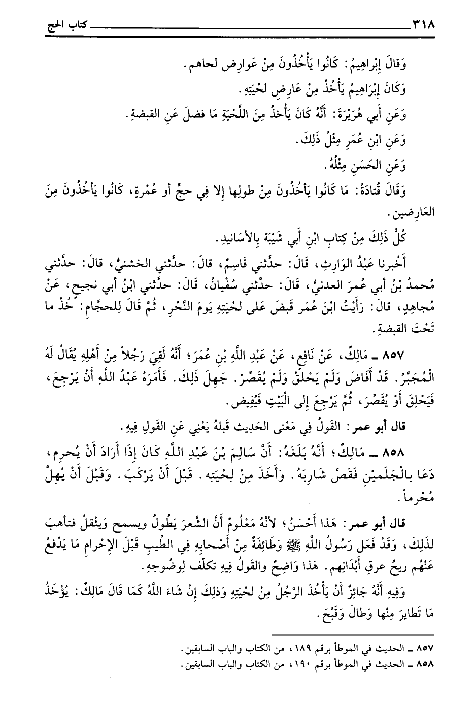 858 - مَالِكٌ أَنَّهُ بَلَغَهُ أَنَّ سَالِمَ بْنَ عَبْدِ اللَّهِ كَانَ إِذَا أَرَادَ أَنْ يُحْرِمَ دَعَا بِالْجَلَمَيْنِ فَقَصَّ شَارِبَهُ وَأَخَذَ مِنْ لِحْيَتِهِ قَبْلَ أَنْ يَرْكَبَ وَقَبْلَ أَنْ يُهِلَّ مُحْرِمًا