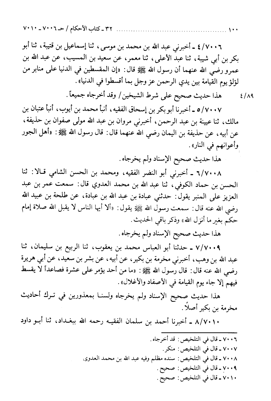 7008 - أَخْبَرَنِي أَبُو النَّضْرِ الْفَقِيهُ، وَمُحَمَّدُ بْنُ الْحَسَنِ الشَّامِيُّ، قَالَا: ثَنَا الْحَسَنُ بْنُ حَمَّادٍ الْكُوفِيُّ، ثَنَا عَبْدُ اللَّهِ بْنُ مُحَمَّدٍ الْعَدَوِيُّ، قَالَ: سَمِعْتُ عُمَرَ بْنَ عَبْدِ الْعَزِيزِ، عَلَى الْمِنْبَرِ يَقُولُ: حَدَّثَنِي عُبَادَةُ بْنُ عَبْدِ اللَّهِ بْنِ عُبَادَةَ، عَنْ طَلْحَةَ بْنِ عُبَيْدِ اللَّهِ، رَضِيَ اللَّهُ عَنْهُ قَالَ: سَمِعْتُ رَسُولَ اللَّهِ صَلَّى اللهُ عَلَيْهِ وَسَلَّمَ يَقُولُ: «أَلَا أَيُّهَا النَّاسُ §لَا يَقْبَلُ اللَّهُ صَلَاةَ إِمَامٍ حَكَمَ بِغَيْرِ مَا أَنْزَلَ اللَّهُ» وَذَكَرَ بَاقِيَ الْحَدِيثِ «هَذَا حَدِيثٌ صَحِيحُ الْإِسْنَادِ وَلَمْ يُخَرِّجَاهُ» K7008 - سنده مظلم