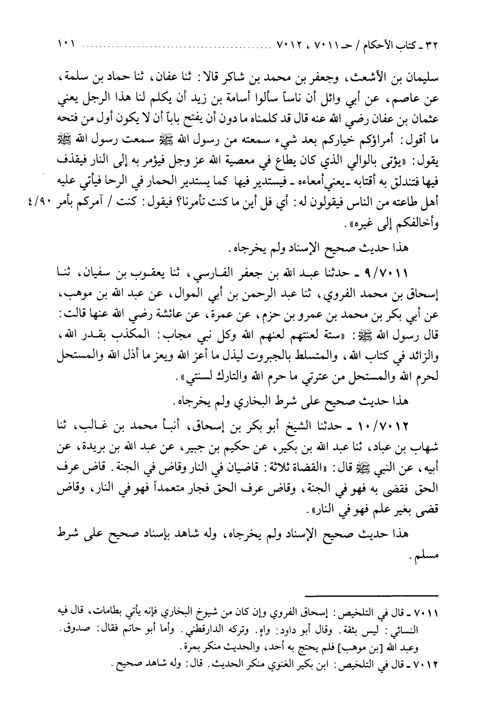 7012 - حَدَّثَنَا الشَّيْخُ أَبُو بَكْرِ بْنُ إِسْحَاقَ، أنبأ مُحَمَّدُ بْنُ غَالِبٍ، ثَنَا شِهَابُ بْنُ عَبَّادٍ، ثَنَا عَبْدُ اللَّهِ بْنُ بُكَيْرٍ، عَنْ حَكِيمِ بْنِ جُبَيْرٍ، عَنْ عَبْدِ اللَّهِ بْنِ بُرَيْدَةَ، عَنْ أَبِيهِ، عَنِ النَّبِيِّ صَلَّى اللهُ عَلَيْهِ وَسَلَّمَ قَالَ: " §الْقُضَاةُ ثَلَاثَةٌ: قَاضِيَانِ فِي النَّارِ وَقَاضٍ فِي الْجَنَّةِ. قَاضٍ عَرَفَ الْحَقَّ فَقَضَى بِهِ فَهُوَ فِي الْجَنَّةِ، وَقَاضٍ عَرَفَ الْحَقَّ فَجَارَ مُتَعَمِّدًا فَهُوَ فِي النَّارِ، وَقَاضٍ قَضَى بِغَيْرِ عِلْمٍ فَهُوَ فِي النَّارِ «هَذَا حَدِيثٌ صَحِيحُ الْإِسْنَادِ وَلَمْ يُخَرِّجَاهُ، وَلَهُ شَاهِدٌ بِإِسْنَادٍ صَحِيحٍ عَلَى شَرْطِ مُسْلِمٍ» K7012 - ابن بكير الغنوي منكر الحديث قال وله شاهد صحيح
