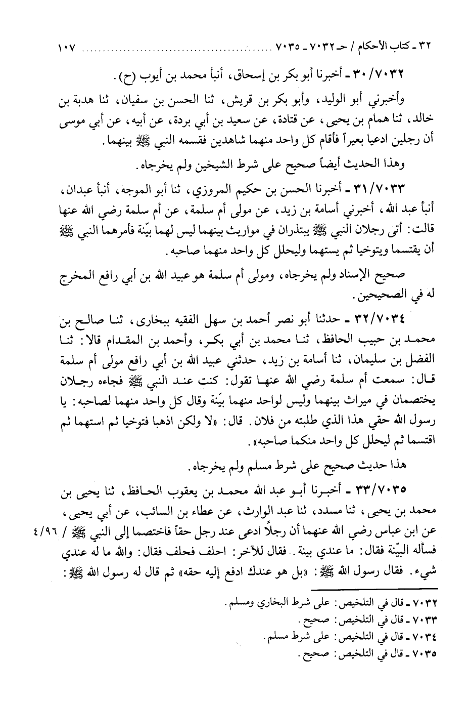 7034 - حَدَّثَنَا أَبُو نَصْرٍ أَحْمَدُ بْنُ سَهْلٍ الْفَقِيهُ، بِبُخَارَى، ثَنَا صَالِحُ بْنُ مُحَمَّدِ بْنِ حَبِيبٍ الْحَافِظُ، ثَنَا مُحَمَّدُ بْنُ أَبِي بَكْرٍ، وَأَحْمَدُ بْنُ الْمِقْدَامِ، قَالَا: ثَنَا الْفَضْلُ بْنُ سُلَيْمَانَ، ثَنَا أُسَامَةُ بْنُ زَيْدٍ، حَدَّثَنِي عُبَيْدُ اللَّهِ بْنُ أَبِي رَافِعٍ، مَوْلَى أُمِّ سَلَمَةَ قَالَ: سَمِعْتُ أُمَّ سَلَمَةَ، رَضِيَ اللَّهُ عَنْهَا تَقُولُ: كُنْتُ عِنْدَ النَّبِيِّ صَلَّى اللهُ عَلَيْهِ وَسَلَّمَ فَجَاءَهُ رَجُلَانِ يَخْتَصِمَانِ فِي مِيرَاثٍ بَيْنَهُمَا وَلَيْسَ لِوَاحِدٍ مِنْهُمَا بَيِّنَةٌ وَقَالَ كُلُّ وَاحِدٍ مِنْهُمَا لِصَاحِبِهِ: يَا رَسُولَ اللَّهِ حَقِّي هَذَا الَّذِي طَلَبْتُهُ مِنْ فُلَانٍ. قَالَ: «لَا وَلَكِنِ §اذْهَبَا فَتَوَخَّيَا ثُمَّ اسْتَهِمَا ثُمَّ اقْتَسِمَا ثُمَّ لِيُحْلِلْ كُلُّ وَاحِدٍ مِنْكُمَا صَاحِبَهُ» هَذَا حَدِيثٌ صَحِيحٌ عَلَى شَرْطِ مُسْلِمٍ وَلَمْ يُخَرِّجَاهُ "K7034 - على شرط مسلم