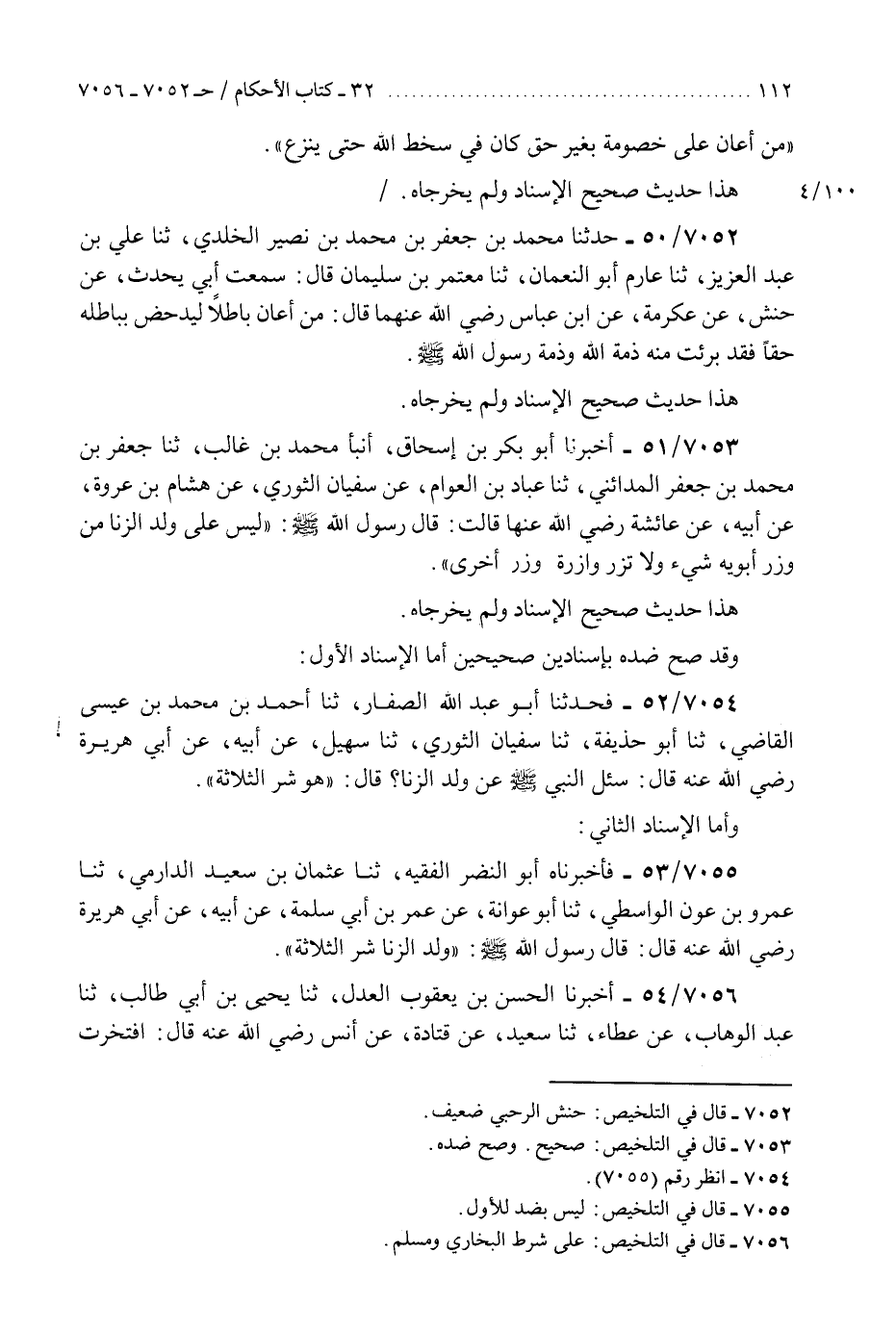 7052 - حَدَّثَنَا مُحَمَّدُ بْنُ جَعْفَرِ بْنُ مُحَمَّدِ بْنِ نُصَيْرٍ الْخُلْدِيُّ، ثَنَا عَلِيُّ بْنُ عَبْدِ الْعَزِيزِ، ثَنَا عَارِمٌ أَبُو النُّعْمَانِ، ثَنَا مُعْتَمِرُ بْنُ سُلَيْمَانَ، قَالَ: سَمِعْتُ أَبِي، يُحَدِّثُ عَنْ حَنَشٍ، عَنْ عِكْرِمَةَ، عَنِ ابْنِ عَبَّاسٍ رَضِيَ اللَّهُ عَنْهُمَا، قَالَ: §«مَنْ أَعَانَ بَاطِلًا لِيُدْحِضَ بِبَاطِلِهِ حَقًّا فَقَدْ بَرِئَتْ مِنْهُ ذِمَّةُ اللَّهِ وَذِمَّةُ رَسُولِ اللَّهِ صَلَّى اللهُ عَلَيْهِ وَسَلَّمَ وَسَلَّمَ» هَذَا حَدِيثٌ صَحِيحُ الْإِسْنَادِ وَلَمْ يُخَرِّجَاهُ "K7052 - حنش الرحبي ضعيف