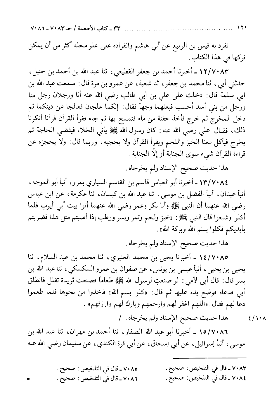 7086 - أَخْبَرَنَا أَبُو عَبْدِ اللَّهِ الصَّفَّارُ، ثَنَا أَحْمَدُ بْنُ مِهْرَانَ، ثَنَا عُبَيْدُ اللَّهِ بْنُ مُوسَى، أَنْبَأَ إِسْرَائِيلُ، عَنْ أَبِي إِسْحَاقَ، عَنْ أَبِي قُرَّةَ الْكِنْدِيِّ، عَنْ سُلَيْمَانَ، رَضِيَ اللَّهُ عَنْهُ قَالَ: صَنَعْتُ طَعَامًا فَأَتَيْتُ بِهِ النَّبِيَّ صَلَّى اللهُ عَلَيْهِ وَسَلَّمَ وَهُوَ جَالِسٌ فَوَضَعْتُهُ بَيْنَ يَدَيْهِ فَقَالَ: «مَا هَذَا؟» قُلْتُ: هَدِيَّةٌ فَوَضَعَ يَدَهُ وَقَالَ لِأَصْحَابِهِ: §«كُلُوا بِسْمِ اللَّهِ» هَذَا حَدِيثٌ صَحِيحُ الْإِسْنَادِ وَلَمْ يُخَرِّجَاهُ "K7086 - صحيح