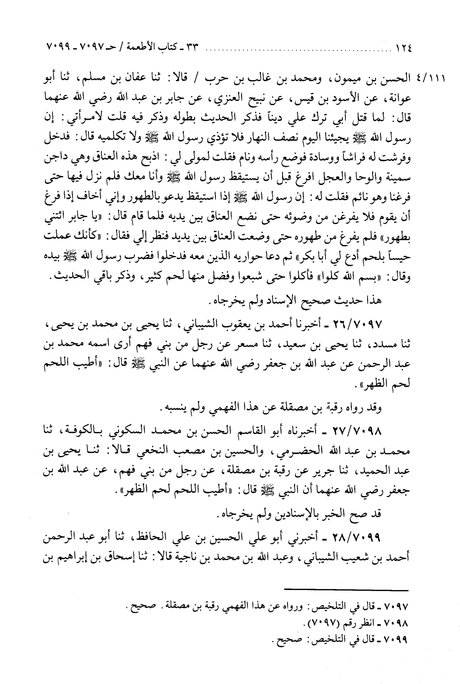 7098 - أَخْبَرَنَاهُ أَبُو الْقَاسِمِ الْحَسَنُ بْنُ مُحَمَّدٍ السَّكُونِيُّ، بِالْكُوفَةِ، ثَنَا مُحَمَّدُ بْنُ عَبْدِ اللَّهِ الْحَضْرَمِيُّ، وَالْحُسَيْنُ بْنُ مُصْعَبٍ النَّخَعِيُّ، قَالَا: ثَنَا يَحْيَى بْنُ عَبْدِ الْحَمِيدِ، ثَنَا جَرِيرٌ، عَنْ رَقَبَةَ بْنِ مَصْقَلَةَ، عَنْ رَجُلٍ، مِنْ بَنِي فَهْمٍ، عَنْ عَبْدِ اللَّهِ بْنِ جَعْفَرٍ، رَضِيَ اللَّهُ عَنْهُمَا أَنَّ النَّبِيَّ صَلَّى اللهُ عَلَيْهِ وَسَلَّمَ قَالَ: §«أَطْيَبُ اللَّحْمِ لَحْمُ الظَّهْرِ» قَدْ صَحَّ الْخَبَرُ بِالْإِسْنَادَيْنِ وَلَمْ يُخَرِّجَاهُ "