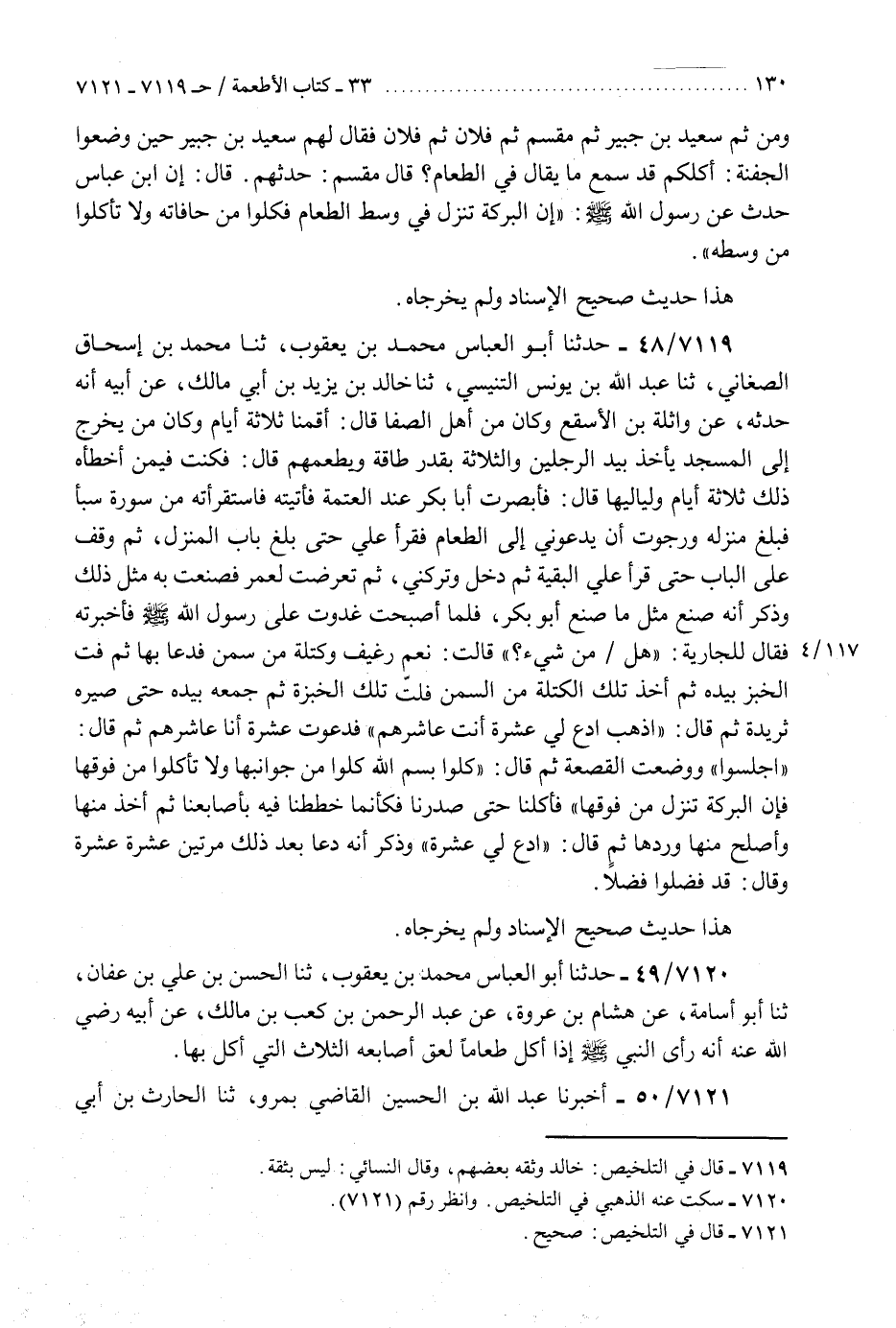 7119 - حَدَّثَنَا أَبُو الْعَبَّاسِ مُحَمَّدُ بْنُ يَعْقُوبَ، ثَنَا مُحَمَّدُ بْنُ إِسْحَاقَ الصَّغَانِيُّ، ثَنَا عَبْدُ اللَّهِ بْنُ يُونُسَ التِّنِّيسِيُّ، ثَنَا خَالِدُ بْنُ يَزِيدَ بْنِ أَبِي مَالِكٍ، عَنْ أَبِيهِ، أَنَّهُ حَدَّثَهُ عَنْ وَاثِلَةَ بْنِ الْأَسْقَعِ، وَكَانَ مِنْ أَهْلِ الصَّفَا قَالَ: أَقَمْنَا ثَلَاثَةَ أَيَّامٍ وَكَانَ مَنْ يَخْرُجُ إِلَى الْمَسْجِدِ يَأْخُذُ بِيَدِ الرَّجُلَيْنِ وَالثَّلَاثَةِ بِقَدْرِ طَاقَةٍ وَيُطْعِمُهُمْ قَالَ: فَكُنْتُ فِيمَنْ أَخْطَأَهُ ذَلِكَ ثَلَاثَةَ أَيَّامٍ وَلَيَالِيهَا قَالَ: فَأَبْصَرْتُ أَبَا بَكْرٍ عِنْدَ الْعَتَمَةِ فَأَتَيْتُهُ فَاسْتَقْرَأْتُهُ مِنْ سُورَةِ سَبَأٍ فَبَلَغَ مَنْزِلَهُ وَرَجَوْتُ أَنْ يَدْعُوَنِي إِلَى الطَّعَامِ فَقَرَأَ عَلَيَّ حَتَّى بَلَغَ بَابَ الْمَنْزِلِ، ثُمَّ وَقَفَ عَلَى الْبَابِ حَتَّى قَرَأَ عَلَيَّ الْبَقِيَّةَ ثُمَّ دَخَلَ وَتَرَكَنِي، ثُمَّ تَعَرَّضْتُ لِعُمَرَ فَصَنَعْتُ بِهِ مِثْلَ ذَلِكَ وَذَكَرَ أَنَّهُ صَنَعَ مِثْلَ مَا صَنَعَ أَبُو بَكْرٍ، فَلَمَّا أَصْبَحْتُ غَدَوْتُ عَلَى رَسُولِ اللَّهِ صَلَّى اللهُ عَلَيْهِ وَسَلَّمَ فَأَخْبَرْتُهُ فَقَالَ لِلْجَارِيَةِ: «هَلْ مِنْ شَيْءٍ؟» قَالَتْ: نَعَمْ رَغِيفٌ وَكُتْلَةٌ مِنْ سَمْنٍ فَدَعَا بِهَا ثُمَّ فَتَّ الْخُبْزَ بِيَدِهِ ثُمَّ أَخَذَ تِلْكَ الْكُتْلَةَ مِنَ السَّمْنِ فَلَتَّ تِلْكَ الْخُبْزَةَ ثُمَّ جَمَعَهُ بِيَدِهِ حَتَّى صَيَّرَهُ ثَرِيدَةً ثُمَّ قَالَ: «اذْهَبِ ادْعُ لِي عَشَرَةً أَنْتَ عَاشِرُهُمْ» فَدَعَوْتُ عَشَرَةً أَنَا عَاشِرُهُمْ ثُمَّ قَالَ: «اجْلِسُوا» وَوضَعْتُ الْقَصْعَةَ ثُمَّ قَالَ: §«كُلُوا بِسْمِ اللَّهِ كُلُوا مِنْ جَوَانِبِهَا وَلَا تَأْكُلُوا مِنْ فَوْقِهَا فَإِنَّ الْبَرَكَةَ تَنْزِلُ مِنْ فَوْقِهَا» فَأَكَلْنَا حَتَّى صَدَرْنَا فَكَأَنَّمَا خَطَطْنَا فِيهِ بِأَصَابِعِنَا ثُمَّ أَخَذَ مِنْهَا وَأَصْلَحْ مِنْهَا وَرَدَّهَا ثُمَّ قَالَ: «ادْعُ لِي عَشَرَةً» وَذَكَرَ أَنَّهُ دَعَا بَعْدَ ذَلِكَ مَرَّتَيْنِ عَشَرَةً عَشَرَةً وَقَالَ: قَدْ فَضَلُوا فَضْلًا «هَذَا حَدِيثٌ صَحِيحُ الْإِسْنَادِ وَلَمْ يُخَرِّجَاهُ» K7119 - خالد وثقه بعضهم وقال النسائي ليس بثقة