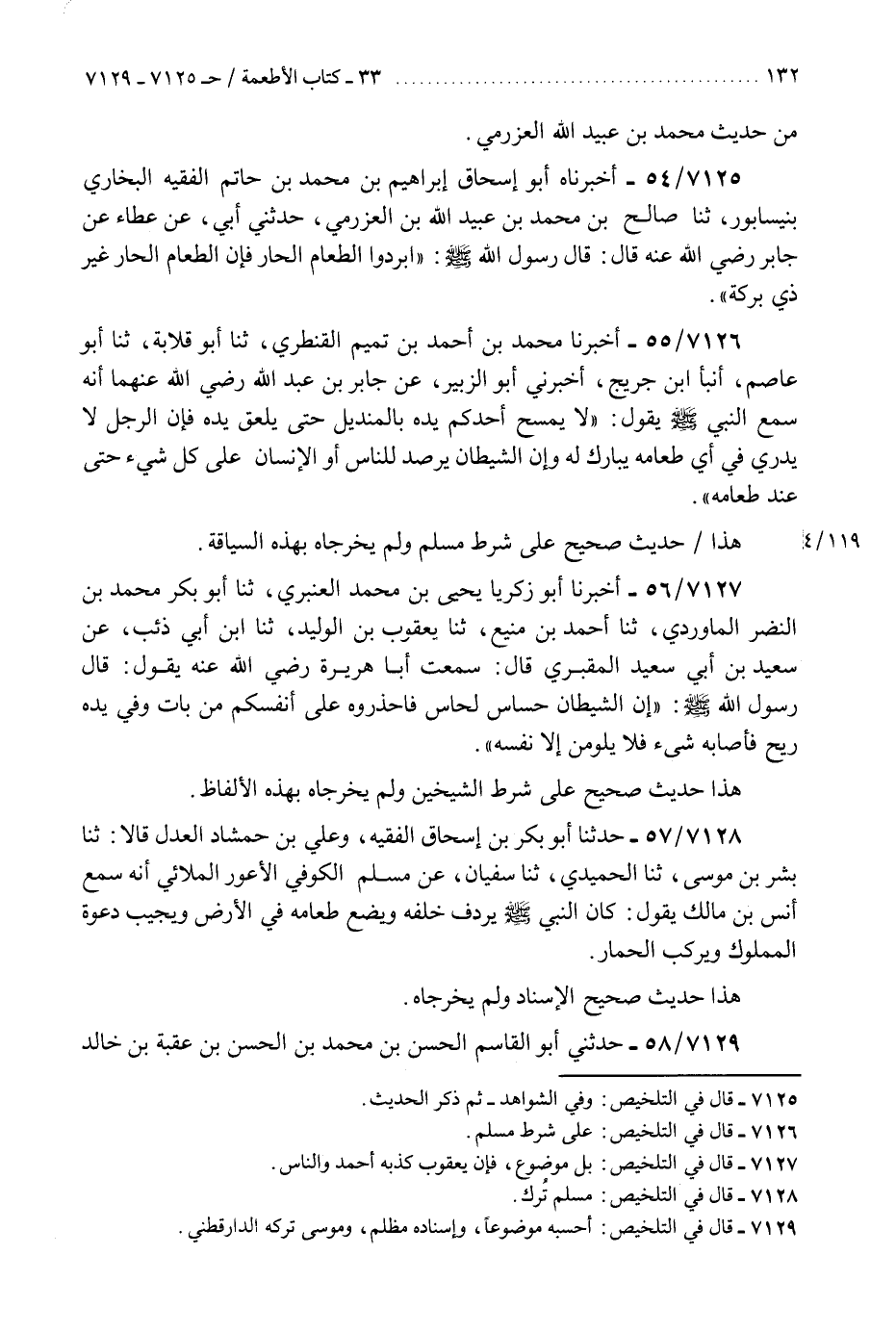 7125 - أَخْبَرَنَاهُ أَبُو إِسْحَاقَ إِبْرَاهِيمُ بْنُ مُحَمَّدِ بْنِ حَاتِمٍ، الْفَقِيهُ الْبُخَارِيُّ بِنَيْسَابُورَ، ثَنَا صَالِحُ بْنُ مُحَمَّدِ بْنِ عُبَيْدِ اللَّهِ بْنِ الْعَزْرَمِيِّ، حَدَّثَنِي أَبِي، عَنْ عَطَاءٍ، عَنْ جَابِرٍ، رَضِيَ اللَّهُ عَنْهُ قَالَ: قَالَ رَسُولُ اللَّهِ صَلَّى اللهُ عَلَيْهِ وَسَلَّمَ: §«أَبْرِدُوا الطَّعَامَ الْحَارَّ فَإِنَّ الطَّعَامَ الْحَارَّ غَيْرُ ذِي بَرَكَةٍ»