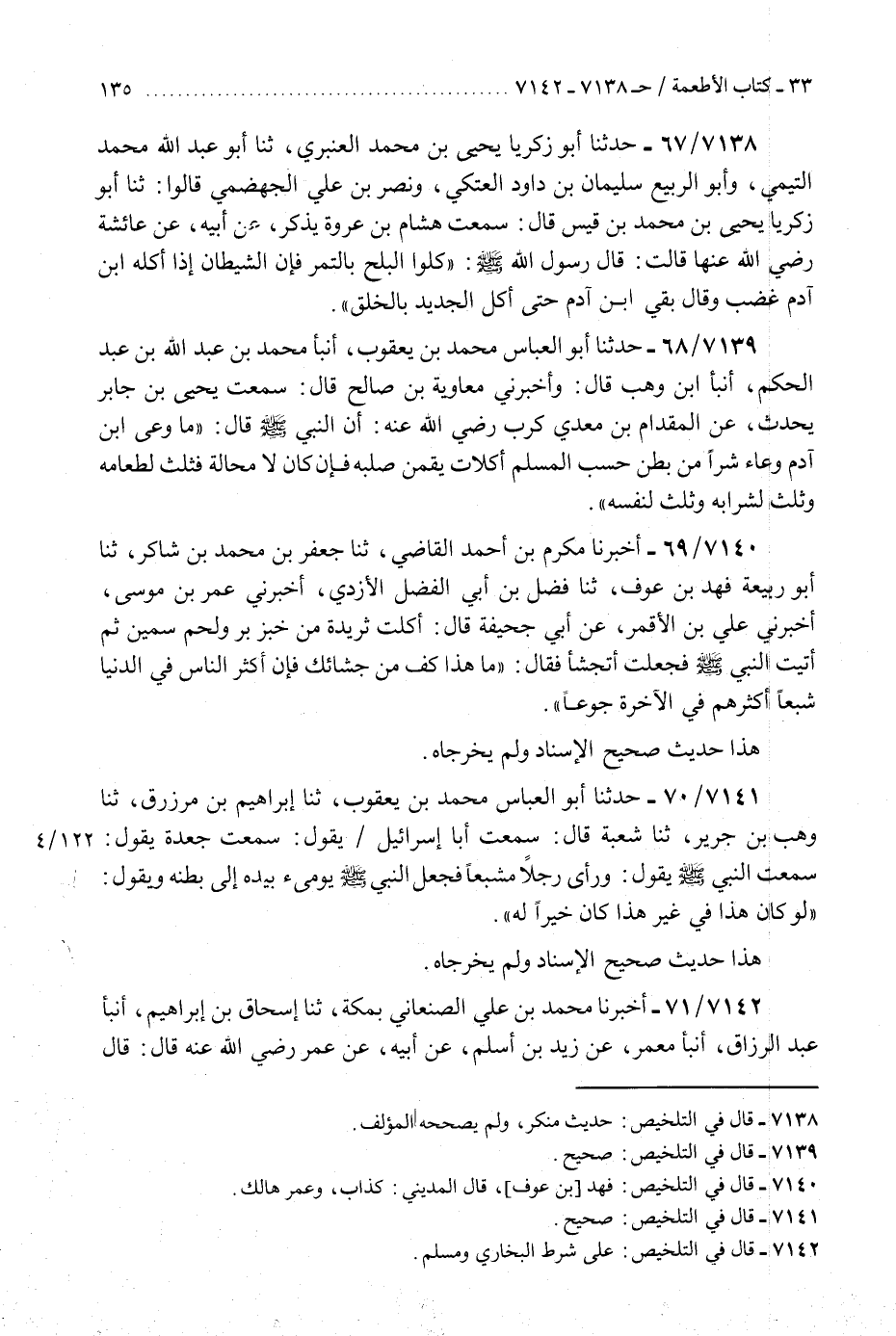 7140 - أَخْبَرَنَا مُكْرَمُ بْنُ أَحْمَدَ الْقَاضِي، ثَنَا جَعْفَرُ بْنُ مُحَمَّدِ بْنِ شَاكِرٍ، ثَنَا أَبُو رَبِيعَةَ فَهْدُ بْنُ عَوْفٍ، ثَنَا فَضْلُ بْنُ أَبِي الْفَضْلِ الْأَزْدِيُّ، أَخْبَرَنِي عُمَرُ بْنُ مُوسَى، أَخْبَرَنِي عَلِيُّ بْنُ الْأَقْمَرِ، عَنْ أَبِي جُحَيْفَةَ، قَالَ: أَكَلْتُ ثَرِيدَةً مِنْ خُبْزٍ بُرٍّ وَلَحْمٍ سَمِينٍ ثُمَّ أَتَيْتُ النَّبِيَّ صَلَّى اللهُ عَلَيْهِ وَسَلَّمَ فَجَعَلْتُ أَتَجَشَّأُ فَقَالَ: §«مَا هَذَا كُفَّ مِنْ جُشَائِكَ فَإِنَّ أَكْثَرَ النَّاسِ فِي الدُّنْيَا شِبَعًا أَكْثَرُهُمْ فِي الْآخِرَةِ جُوعًا» هَذَا حَدِيثٌ صَحِيحُ الْإِسْنَادِ وَلَمْ يُخَرِّجَاهُ "K7140 - فهد بن عوف قال المديني كذاب وعمر هالك