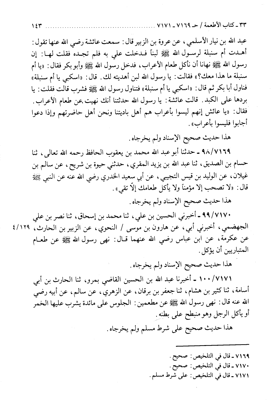 7171 - أَخْبَرَنَا عَبْدُ اللَّهِ بْنُ الْحُسَيْنِ الْقَاضِي، بِمَرْوَ، ثَنَا الْحَارِثُ بْنُ أَبِي أُسَامَةَ، ثَنَا كَثِيرُ بْنُ هِشَامٍ، ثَنَا جَعْفَرُ بْنُ بُرْقَانَ، عَنِ الزُّهْرِيِّ، عَنْ سَالِمٍ، عَنْ أَبِيهِ، رَضِيَ اللَّهُ عَنْهُ، قَالَ: §" نَهَى رَسُولُ اللَّهِ صَلَّى اللهُ عَلَيْهِ وَسَلَّمَ عَنْ مَطْعَمَيْنِ: الْجُلُوسُ عَلَى مَائِدَةٍ يُشْرَبُ عَلَيْهَا الْخَمْرُ أَوْ يَأْكُلُ الرَّجُلُ وَهُوَ مُنْبَطِحٌ عَلَى بَطْنِهِ «» هَذَا حَدِيثٌ صَحِيحٌ عَلَى شَرْطِ مُسْلِمٍ وَلَمْ يُخَرِّجَاهُ "K7171 - على شرط مسلم