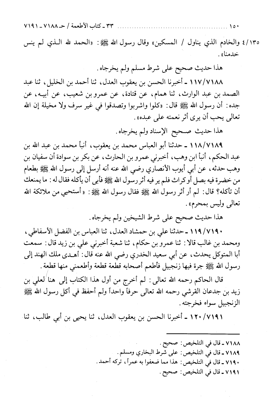 7191 - أَخْبَرَنَا الْحَسَنُ بْنُ يَعْقُوبَ الْعَدْلُ، ثَنَا يَحْيَى بْنُ أَبِي طَالِبٍ، ثَنَا زَيْدُ بْنُ الْحُبَابِ، ثَنَا مُعَاوِيَةُ بْنُ صَالِحٍ، ثَنَا عَامِرٌ، عَنْ خَالِدِ بْنِ مَعْدَانَ، قَالَ: شَهِدْتُ وَلِيمَةً فِي مَنْزِلِ عَبْدِ الْأَعْلَى وَمَعَنَا أَبُو أُمَامَةَ الْبَاهِلِيُّ، رَضِيَ اللَّهُ عَنْهُ فَلَمَّا أَنْ فَرَغْنَا مِنَ الطَّعَامِ قَامَ فَقَالَ: مَا أُرِيدُ أَنْ أَكُونَ خَطِيبًا وَلَكِنِّي سَمِعْتُ رَسُولَ اللَّهِ صَلَّى اللهُ عَلَيْهِ وَسَلَّمَ عِنْدَ فَرَاغِهِ مِنَ الطَّعَامِ يَقُولُ: §«الْحَمْدُ لِلَّهِ كَثِيرًا طَيِّبًا مُبَارَكًا فِيهِ غَيْرَ مُوَدَّعٍ وَلَا مُسْتَغْنًى عَنْهُ» هَذَا حَدِيثٌ صَحِيحُ الْإِسْنَادِ وَلَمْ يُخَرِّجَاهُ، وَشَاهِدَهُ أَصَحُّ وَأَشْهَرُ رُوَاةً مِنْهُ "K7191 - صحيح