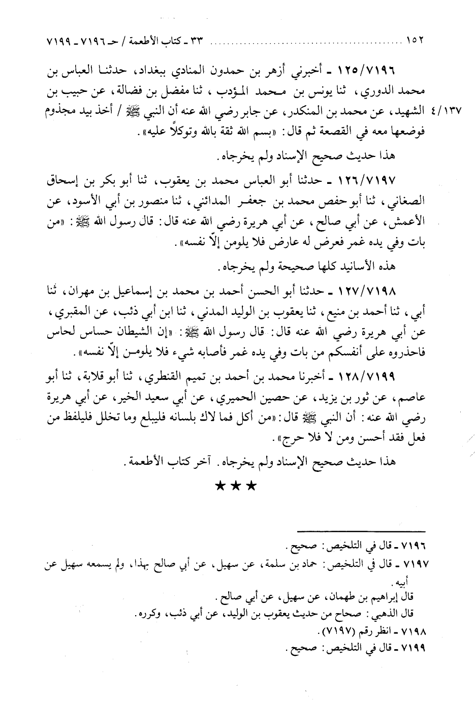 7196 - أَخْبَرَنِي أَزْهَرُ بْنُ حَمْدُونٍ الْمُنَادِي، بِبَغْدَادَ، حَدَّثَنَا الْعَبَّاسُ بْنُ مُحَمَّدٍ الدُّورِيُّ، ثَنَا يُونُسُ بْنُ مُحَمَّدٍ الْمُؤَدِّبُ، ثَنَا مُفَضَّلُ بْنُ فَضَالَةَ، عَنْ حَبِيبِ بْنِ الشَّهِيدِ، عَنْ مُحَمَّدِ بْنِ الْمُنْكَدِرِ، عَنْ جَابِرٍ، رَضِيَ اللَّهُ عَنْهُ أَنَّ النَّبِيَّ صَلَّى اللهُ عَلَيْهِ وَسَلَّمَ أَخَذَ بِيَدِ مَجْذُومٍ فَوَضَعَهَا مَعَهُ فِي الْقَصْعَةِ ثُمَّ قَالَ: §«بِسْمِ اللَّهِ ثِقَةً بِاللَّهِ وَتَوَكُّلًا عَلَيْهِ» هَذَا حَدِيثٌ صَحِيحُ الْإِسْنَادِ وَلَمْ يُخَرِّجَاهُ "K7196 - صحيح