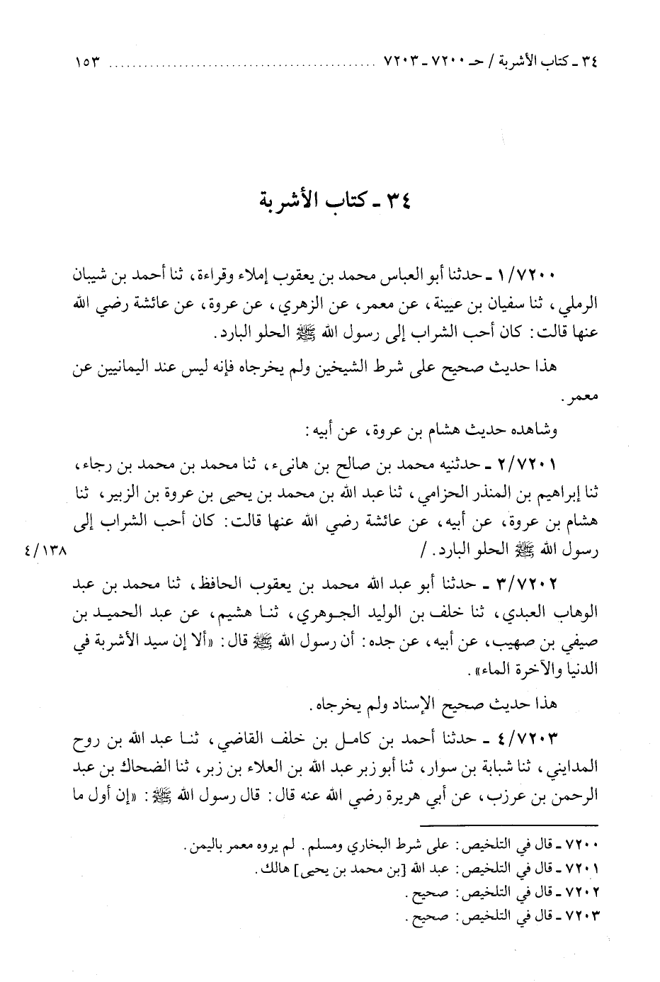 7200 - حَدَّثَنَا أَبُو الْعَبَّاسِ مُحَمَّدُ بْنُ يَعْقُوبَ إِمْلَاءً وَقِرَاءَةً، ثَنَا أَحْمَدُ بْنُ شَيْبَانَ الرَّمْلِيُّ، ثَنَا سُفْيَانُ بْنُ عُيَيْنَةَ، عَنْ مَعْمَرٍ، عَنِ الزُّهْرِيِّ، عَنْ عُرْوَةَ، عَنْ عَائِشَةَ، رَضِيَ اللَّهُ عَنْهَا قَالَتْ: «كَانَ §أَحَبُّ الشَّرَابِ إِلَى رَسُولِ اللَّهِ صَلَّى اللهُ عَلَيْهِ وَسَلَّمَ الْحُلْوَ الْبَارِدَ» هَذَا حَدِيثٌ صَحِيحٌ عَلَى شَرْطِ الشَّيْخَيْنِ وَلَمْ يُخَرِّجَاهُ فَإِنَّهُ لَيْسَ عِنْدَ الْيَمَانِيِّينَ عَنْ مَعْمَرٍ "K7200 - على شرط البخاري ومسلم