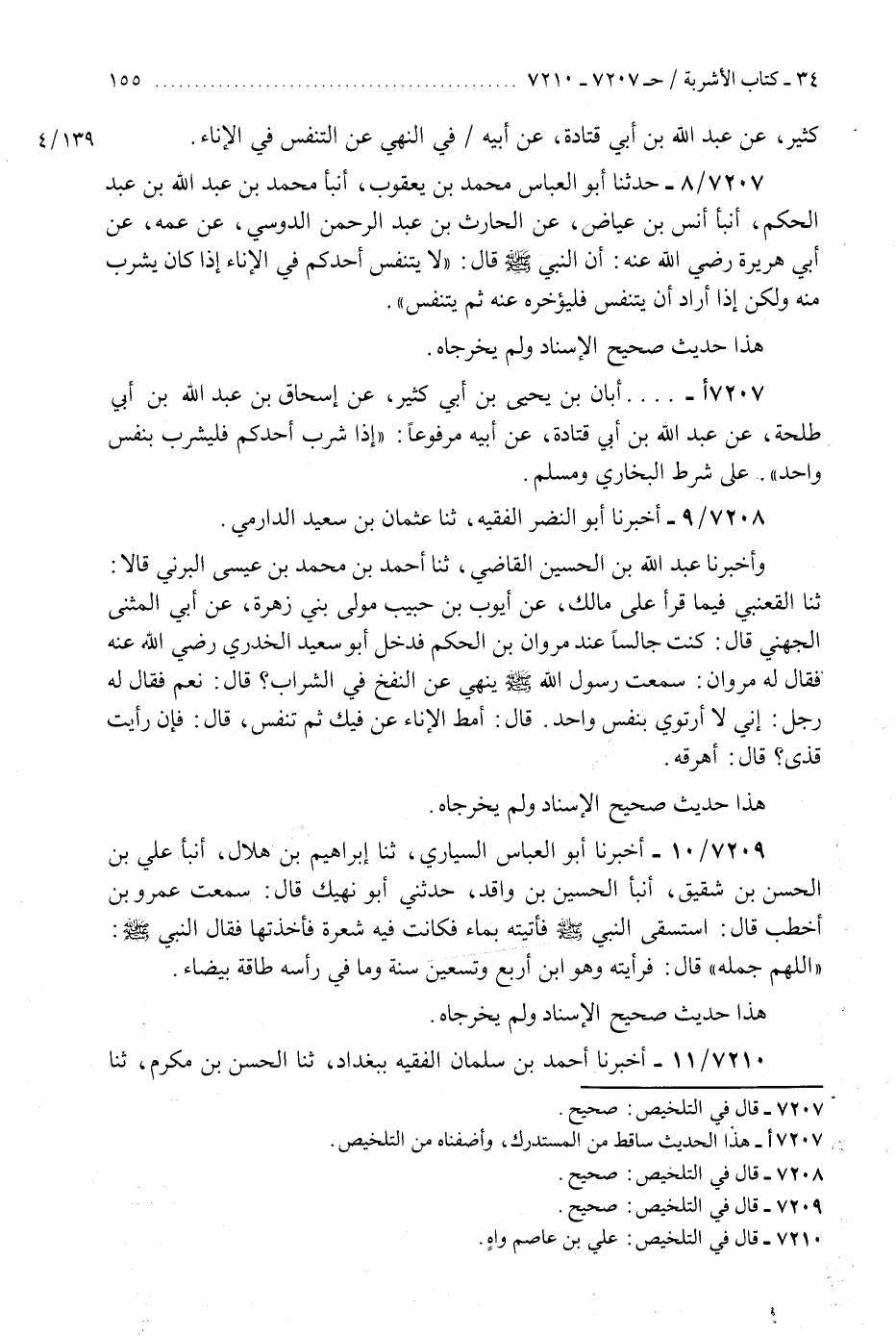 7207 - حَدَّثَنَا أَبُو الْعَبَّاسِ مُحَمَّدُ بْنُ يَعْقُوبَ، أَنْبَأَ مُحَمَّدُ بْنُ عَبْدِ اللَّهِ بْنِ عَبْدِ الْحَكَمِ، أَنْبَأَ أَنَسُ بْنُ عِيَاضٍ، عَنِ الْحَارِثِ بْنِ عَبْدِ الرَّحْمَنِ الدَّوْسِيِّ، عَنْ عَمِّهِ، عَنْ أَبِي هُرَيْرَةَ، رَضِيَ اللَّهُ عَنْهُ أَنَّ النَّبِيَّ صَلَّى اللهُ عَلَيْهِ وَسَلَّمَ قَالَ: §«لَا يَتَنَفَّسْ أَحَدُكُمْ فِي الْإِنَاءِ إِذَا كَانَ يَشْرَبُ مِنْهُ وَلَكِنْ إِذَا أَرَادَ أَنْ يَتَنَفَّسَ فَلْيُؤَخِّرْهُ عَنْهُ ثُمَّ يَتَنَفَّسُ» هَذَا حَدِيثٌ صَحِيحُ الْإِسْنَادِ وَلَمْ يُخَرِّجَاهُ "K7207 - صحيح