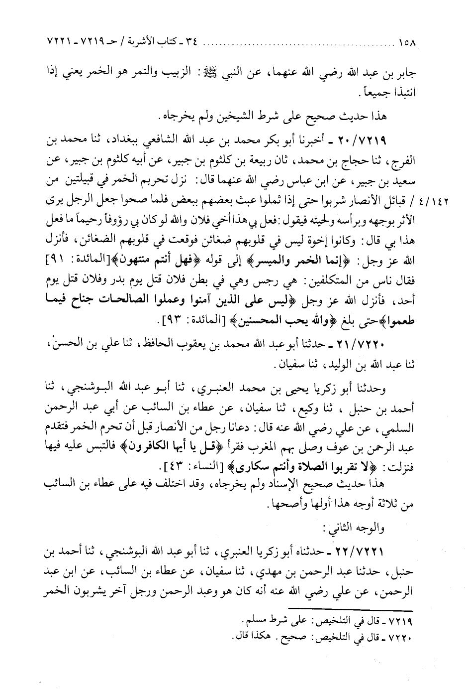 7220 - حَدَّثَنَا أَبُو عَبْدِ اللَّهِ مُحَمَّدُ بْنُ يَعْقُوبَ الْحَافِظُ، ثَنَا عَلِيُّ بْنُ الْحَسَنِ، ثَنَا عَبْدُ اللَّهِ بْنُ الْوَلِيدِ، ثَنَا سُفْيَانُ، وَحَدَّثَنَا أَبُو زَكَرِيَّا يَحْيَى بْنُ مُحَمَّدٍ الْعَنْبَرِيُّ، ثَنَا أَبُو عَبْدِ اللَّهِ الْبُوشَنْجِيُّ، ثَنَا أَحْمَدُ بْنُ حَنْبَلٍ، ثَنَا وَكِيعٌ، ثَنَا سُفْيَانُ، عَنْ عَطَاءِ بْنِ السَّائِبِ، عَنْ أَبِي عَبْدِ الرَّحْمَنِ السُّلَمِيِّ، عَنْ عَلِيٍّ، رَضِيَ اللَّهُ عَنْهُ قَالَ: §" دَعَانَا رَجُلٌ مِنَ الْأَنْصَارِ قَبْلَ أَنْ تُحَرَّمَ الْخَمْرُ فَتَقَدَّمَ عَبْدُ الرَّحْمَنِ بْنُ عَوْفٍ وَصَلَّى بِهِمُ الْمَغْرِبَ فَقَرَأَ: قُلْ يَا أَيُّهَا الْكَافِرُونَ فَالْتَبَسَ عَلَيْهِ فِيهَا " فَنَزَلَتْ: {لَا تَقْرَبُوا الصَّلَاةَ وَأَنْتُمْ سُكَارَى} [النساء: 43] «هَذَا حَدِيثٌ صَحِيحُ الْإِسْنَادِ وَلَمْ يُخَرِّجَاهُ، وَقَدِ اخْتُلِفَ فِيهِ عَلَى عَطَاءِ بْنِ السَّائِبِ مِنْ ثَلَاثَةِ أَوْجُهٍ هَذَا أَوَّلُهَا وَأَصَحُّهَا» K7220 - صحيح