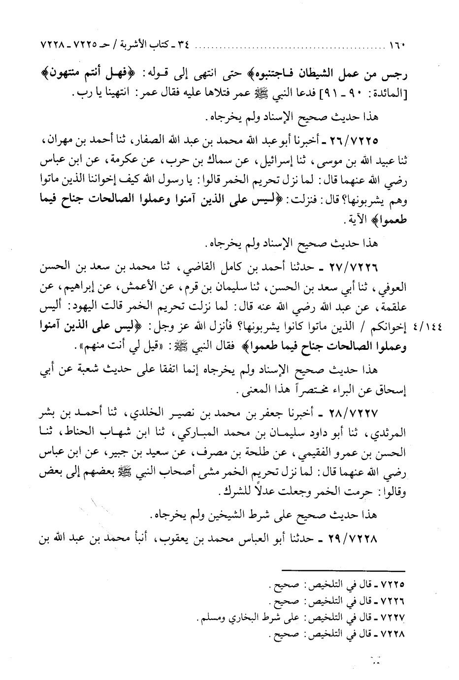 7225 - أَخْبَرَنَا أَبُو عَبْدِ اللَّهِ مُحَمَّدُ بْنُ عَبْدِ اللَّهِ الصَّفَّارُ، ثَنَا أَحْمَدُ بْنُ مِهْرَانَ، ثَنَا عُبَيْدُ اللَّهِ بْنِ مُوسَى، ثَنَا إِسْرَائِيلُ، عَنْ سِمَاكِ بْنِ حَرْبٍ، عَنْ عِكْرِمَةَ، عَنِ ابْنِ عَبَّاسٍ، رَضِيَ اللَّهُ عَنْهُمَا قَالَ: " لَمَّا نَزَلَتْ تَحْرِيمُ الْخَمْرِ قَالُوا: يَا رَسُولَ اللَّهِ كَيْفَ إِخْوَانُنَا الَّذِينَ مَاتُوا وَهُمْ يَشْرَبُونَهَا؟ قَالَ: فَنَزَلَتْ: {§لَيْسَ عَلَى الَّذِينَ آمَنُوا وَعَمِلُوا الصَّالِحَاتِ جُنَاحٌ فِيمَا طَعِمُوا} [المائدة: 93] «الْآيَةَ» هَذَا حَدِيثٌ صَحِيحُ الْإِسْنَادِ وَلَمْ يُخَرِّجَاهُ "K7225 - صحيح