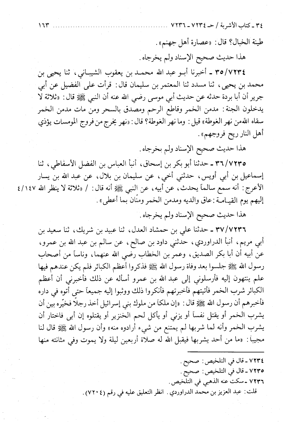 7236 - حَدَّثَنَا عَلِيُّ بْنُ حَمْشَاذَ الْعَدْلُ، ثَنَا عُبَيْدُ بْنُ شَرِيكٍ، ثَنَا سَعِيدُ بْنُ أَبِي مَرْيَمَ، أَنْبَأَ الدَّرَاوَرْدِيُّ، حَدَّثَنِي دَاوُدُ بْنُ صَالِحٍ، عَنْ سَالِمِ بْنِ عَبْدِ اللَّهِ بْنِ عُمَرَ، عَنْ أَبِيهِ، أَنَّ أَبَا بَكْرٍ الصِّدِّيقَ، وَعُمَرَ بْنَ الْخَطَّابِ رَضِيَ اللَّهُ عَنْهُمَا، وَنَاسًا مِنْ أَصْحَابِ رَسُولِ اللَّهِ صَلَّى اللهُ عَلَيْهِ وَسَلَّمَ جَلَسُوا بَعْدَ وَفَاةِ رَسُولِ اللَّهِ صَلَّى اللهُ عَلَيْهِ وَسَلَّمَ فَذَكَرُوا أَعْظَمَ الْكَبَائِرِ فَلَمْ يَكُنْ عِنْدَهُمْ فِيهَا عِلْمٌ يَنْتَهُونَ إِلَيْهِ فَأَرْسَلُونِي إِلَى عَبْدِ اللَّهِ بْنِ عَمْرٍو، أَسْأَلُهُ عَنْ ذَلِكَ فَأَخْبَرَنِي أَنَّ أَعْظَمَ الْكَبَائِرِ شُرْبُ الْخَمْرِ فَأَتَيْتُهُمْ فَأَخْبَرْتُهُمْ فَأَنْكَرُوا ذَلِكَ وَوَثَبُوا إِلَيْهِ جَمِيعًا حَتَّى أَتَوْهُ فِي دَارِهِ فَأَخْبَرَهُمْ أَنَّ رَسُولَ اللَّهِ صَلَّى اللهُ عَلَيْهِ وَسَلَّمَ قَالَ: «إِنَّ مَلِكًا مِنْ مُلُوكِ بَنِي إِسْرَائِيلَ أَخَذَ رَجُلًا فَخَيَّرَهُ بَيْنَ أَنْ يَشْرَبَ الْخَمْرَ أَوْ يَقْتُلَ نَفْسًا أَوْ يَزْنِيَ أَوْ يَأْكُلَ لَحْمَ الْخِنْزِيرِ أَوْ يَقْتُلُوهُ إِنْ أَبَى فَاخْتَارَ أَنْ يَشْرَبَ الْخَمْرَ وَأَنَّهُ لَمَّا شَرِبَهَا لَمْ يَمْتَنِعْ مِنْ شَيْءٍ أَرَادُوهُ مِنْهُ» وَأَنَّ رَسُولَ اللَّهِ صَلَّى اللهُ عَلَيْهِ وَسَلَّمَ قَالَ لَنَا مُجِيبًا: §«مَا مِنْ أَحَدٍ يَشْرَبُهَا فَيَقْبَلَ اللَّهُ لَهُ صَلَاةً أَرْبَعِينَ لَيْلَةً وَلَا يَمُوتُ وَفِي مَثَانَتِهِ مِنْهَا شَيْءٌ إِلَّا حُرِّمَتْ عَلَيْهِ بِهَا الْجَنَّةُ، فَإِنْ مَاتَ فِي أَرْبَعِينَ لَيْلَةً مَاتَ مَيْتَةً جَاهِلِيَّةً» هَذَا حَدِيثٌ صَحِيحٌ عَلَى شَرْطِ مُسْلِمٍ وَلَمْ يُخَرِّجَاهُ "K7236 - سكت عنه الذهبي في التلخيص