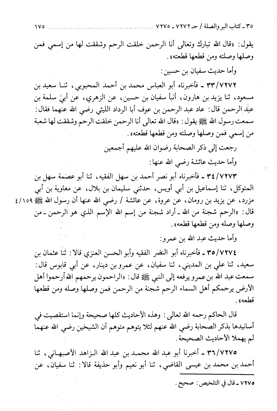 7274 - فَأَخْبَرَنَاهُ أَبُو النَّضْرِ الْفَقِيهُ، وَأَبُو الْحَسَنِ الْعَنَزِيُّ، قَالَا: ثَنَا عُثْمَانُ بْنُ سَعِيدٍ، ثَنَا عَلِيُّ بْنُ الْمَدِينِيِّ، ثَنَا سُفْيَانُ، عَنْ عَمْرِو بْنِ دِينَارٍ، عَنْ أَبِي قَابُوسٍ، قَالَ: سَمِعْتُ عَبْدَ اللَّهِ بْنَ عَمْرٍو، يَرْفَعُهُ إِلَى النَّبِيِّ صَلَّى اللهُ عَلَيْهِ وَسَلَّمَ قَالَ: §«الرَّاحِمُونَ يَرْحَمُهُمُ اللَّهُ ارْحَمُوا أَهْلَ الْأَرْضِ يَرْحَمْكُمْ أَهْلُ السَّمَاءِ الرَّحِمُ شَجْنَةٌ مِنَ الرَّحْمَنِ فَمَنْ وَصَلَهَا وَصَلَهُ وَمَنْ قَطَعَهَا قَطَعَهُ» قَالَ الْحَاكِمُ رَحِمَهُ اللَّهُ تَعَالَى: «وَهَذِهِ الْأَحَادِيثُ كُلُّهَا صَحِيحَةٌ وَإِنَّمَا اسْتَقْصَيْتُ فِي أَسَانِيدِهَا بِذِكْرِ الصَّحَابَةِ رَضِيَ اللَّهُ عَنْهُمْ لِئَلَّا يَتَوَهَّمَ مُتَوَهِّمٌ أَنَّ الشَّيْخَيْنِ رَضِيَ اللَّهُ عَنْهُمَا لَمْ يَهْمِلَا الْأَحَادِيثَ الصَّحِيحَةَ» K7274 - صحيح