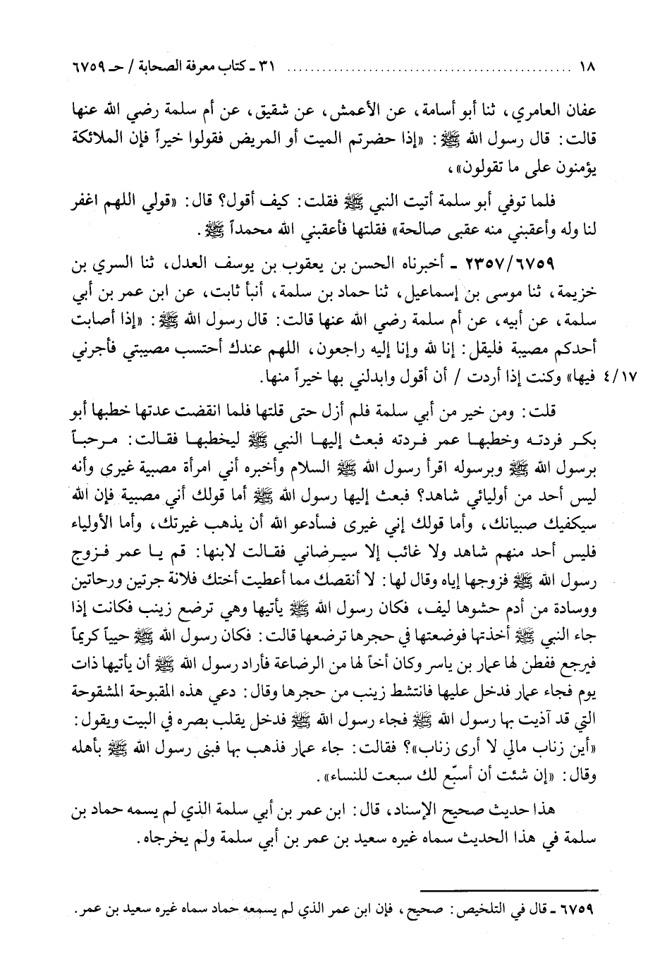 6759 - أَخْبَرَنَاهُ الْحَسَنُ بْنُ يَعْقُوبَ بْنِ يُوسُفَ الْعَدْلُ، ثنا السَّرِيُّ بْنُ خُزَيْمَةَ، ثنا مُوسَى بْنُ إِسْمَاعِيلَ، ثنا حَمَّادُ بْنُ سَلَمَةَ، أَنْبَأَ ثَابِتٌ، عَنِ ابْنِ عُمَرَ بْنِ أَبِي سَلَمَةَ، عَنْ أَبِيهِ، عَنْ أُمِّ سَلَمَةَ، رَضِيَ اللَّهُ عَنْهَا قَالَتْ: قَالَ رَسُولُ اللَّهِ صَلَّى اللهُ عَلَيْهِ وَسَلَّمَ: " §إِذَا أَصَابَتْ أَحَدَكُمْ مُصِيبَةٌ فَلْيَقُلْ: إِنَّا لِلَّهِ وَإِنَّا إِلَيْهِ رَاجِعُونَ، اللَّهُمَّ عِنْدَكَ أَحْتَسِبُ مُصِيبَتِي فَأْجُرْنِي فِيهَا " وَكُنْتُ إِذَا أَرَدْتُ أَنْ أَقُولَ وَأَبْدِلْنِي بِهَا خَيْرًا مِنْهَا قُلْتُ: وَمَنْ خَيْرٌ مِنْ أَبِي سَلَمَةَ فَلَمْ أَزَلْ حَتَّى قُلْتُهَا، فَلَمَّا انْقَضَتْ عِدَّتُهَا خَطَبَهَا أَبُو بَكْرٍ فَرَدَّتْهُ وَخَطَبَهَا عُمَرُ، فَرَدَّتْهُ فَبَعَثَ إِلَيْهَا النَّبِيُّ صَلَّى اللهُ عَلَيْهِ وَسَلَّمَ لِيَخْطُبَهَا فَقَالَتْ: مَرْحَبًا بِرَسُولِ اللَّهِ صَلَّى اللهُ عَلَيْهِ وَسَلَّمَ وَبِرَسُولِهِ، أَقْرئْ رَسُولَ اللَّهِ صَلَّى اللهُ عَلَيْهِ وَسَلَّمَ السَّلَامَ وَأَخْبِرْهُ أَنِّي امْرَأَةٌ مُصْبِيَةٌ غَيْرَى، وَأَنَّهُ لَيْسَ أَحَدٌ مِنْ أَوْلِيَائِي شَاهِدٌ، فَبَعَثَ إِلَيْهَا رَسُولُ اللَّهِ صَلَّى اللهُ عَلَيْهِ وَسَلَّمَ " أَمَّا قَوْلُكِ: إِنِّي مُصْبِيَةٌ فَإِنَّ اللَّهَ سَيَكْفِيكِ صِبْيَانَكِ، وَأَمَّا قَوْلُكِ: إِنِّي غَيْرَى فَسَأَدْعُو اللَّهَ أَنْ يُذْهِبَ غَيْرَتَكِ، وَأَمَّا الْأَوْلِيَاءُ فَلَيْسَ أَحَدٌ مِنْهُمْ شَاهِدٌ وَلَا غَائِبٌ إِلَّا سَيَرْضَانِي " فَقَالَتْ لِابْنِهَا: قُمْ يَا عُمَرُ فَزَوِّجْ رَسُولَ اللَّهِ صَلَّى اللهُ عَلَيْهِ وَسَلَّمَ فَزَوَّجَهَا إِيَّاهُ وَقَالَ لَهَا: لَا أُنْقِصُكِ مِمَّا أَعْطَيْتُ أُخْتَكِ فُلَانَةَ جَرَّتَيْنِ وَرَحَاتَيْنِ وَوِسَادَةٍ مِنْ أَدَمٍ حَشْوُهَا لِيفٌ، فَكَانَ رَسُولُ اللَّهِ صَلَّى اللهُ عَلَيْهِ وَسَلَّمَ يَأْتِيهَا وَهِيَ تُرْضِعُ زَيْنَبَ، فَكَانَتْ إِذَا جَاءَ النَّبِيُّ صَلَّى اللهُ عَلَيْهِ وَسَلَّمَ أَخَذَتْهَا فَوَضَعَتْهَا فِي حِجْرِهَا تُرْضِعُهَا، قَالَتْ: فَكَانَ رَسُولُ اللَّهِ صَلَّى اللهُ عَلَيْهِ وَسَلَّمَ حَيِيًّا كَرِيمًا فَيَرْجِعُ، فَفَطِنَ لَهَا عَمَّارُ بْنُ يَاسِرٍ وَكَانَ أَخًا لَهَا مِنَ الرَّضَاعَةِ، فَأَرَادَ رَسُولُ اللَّهِ صَلَّى اللهُ عَلَيْهِ وَسَلَّمَ أَنْ يَأْتِيَهَا ذَاتَ يَوْمٍ، فَجَاءَ عَمَّارٌ فَدَخَلَ عَلَيْهَا فَانْتَشَطَ زَيْنَبَ مِنْ حِجْرِهَا، وَقَالَ: دَعِي هَذِهِ الْمَقْبُوحَةَ الْمَشْقُوحَةَ الَّتِي قَدْ آذَيْتِ بِهَا رَسُولَ اللَّهِ صَلَّى اللهُ عَلَيْهِ وَسَلَّمَ، فَجَاءَ رَسُولُ اللَّهِ صَلَّى اللهُ عَلَيْهِ وَسَلَّمَ فَدَخَلَ يُقَلِّبُ بَصَرَهُ فِي الْبَيْتِ وَيَقُولُ: «أَيْنَ زُنَابُ، مَا لِي لَا أَرَى زُنَابَ؟» فَقَالَتْ: جَاءَ عَمَّارٌ فَذَهَبَ بِهَا فَبَنَى رَسُولُ اللَّهِ صَلَّى اللهُ عَلَيْهِ وَسَلَّمَ بِأَهْلِهِ، وَقَالَ: «إِنْ شِئْتِ أَنْ أُسَبِّعَ لَكِ سَبَّعْتُ لِلنِّسَاءِ» هَذَا حَدِيثٌ صَحِيحُ الْإِسْنَادِ " قَالَ: " ابْنُ عُمَرَ بْنُ أَبِي سَلَمَةَ: الَّذِي لَمْ يُسَمِّهِ حَمَّادُ بْنُ سَلَمَةَ فِي هَذَا الْحَدِيثِ سَمَّاهُ غَيْرُهُ سَعِيدَ بْنَ عُمَرَ بْنِ أَبِي سَلَمَةَ وَلَمْ يُخَرِّجَاهُ "K6759 - صحيح