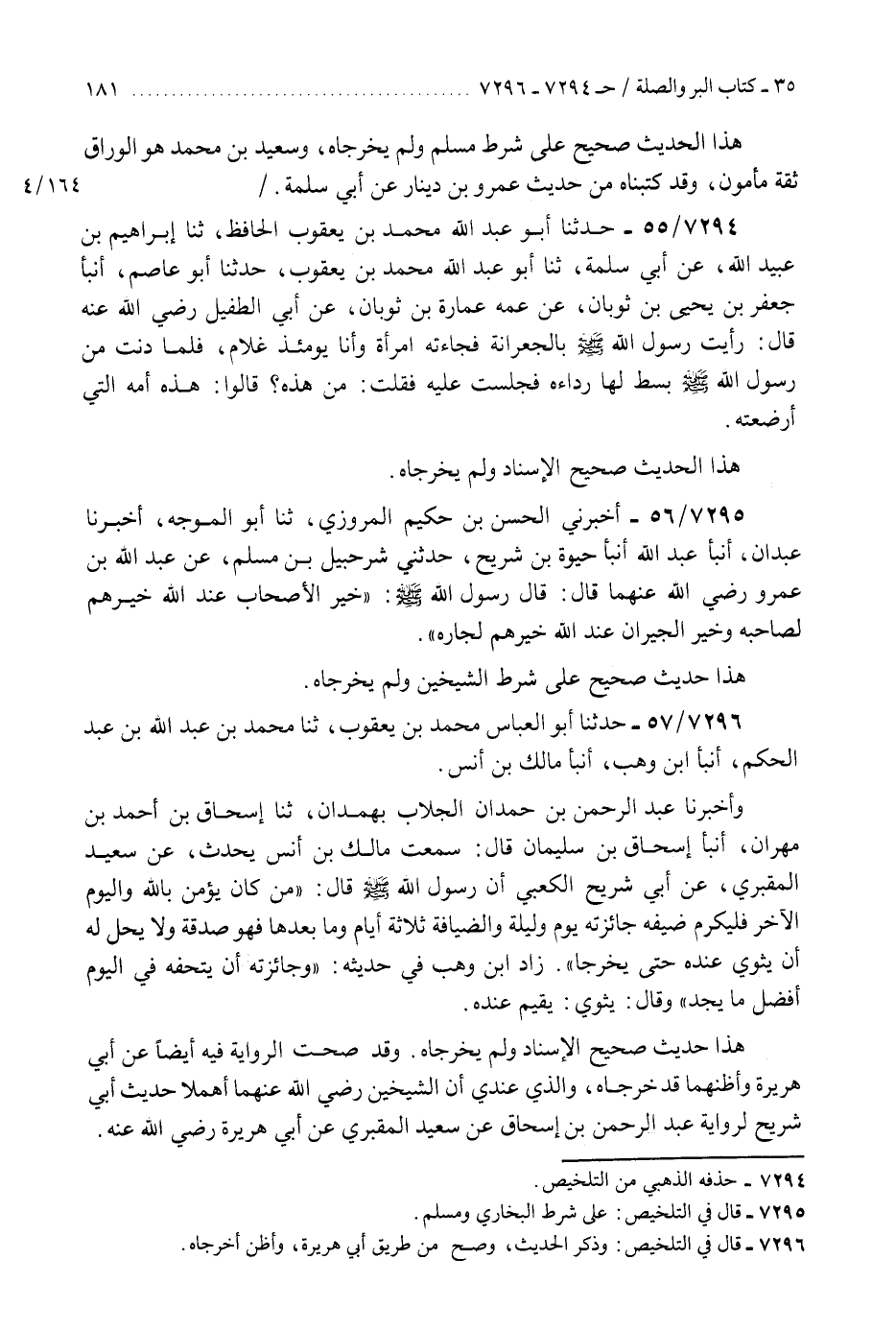 7296 - حَدَّثَنَا أَبُو الْعَبَّاسِ مُحَمَّدُ بْنُ يَعْقُوبَ، ثَنَا مُحَمَّدُ بْنُ عَبْدِ اللَّهِ بْنِ عَبْدِ الْحَكَمِ، أَنْبَأَ ابْنُ وَهْبٍ، أَنْبَأَ مَالِكُ بْنُ أَنَسٍ، وَأَخْبَرَنَا عَبْدُ الرَّحْمَنِ بْنُ حَمْدَانَ الْجَلَّابُ، بِهَمْدَانَ، ثَنَا إِسْحَاقُ بْنُ أَحْمَدَ بْنِ مِهْرَانَ، أَنْبَأَ إِسْحَاقُ بْنُ سُلَيْمَانَ، قَالَ: سَمِعْتُ مَالِكَ بْنَ أَنَسٍ، يُحَدِّثُ عَنْ سَعِيدٍ الْمَقْبُرِيِّ، عَنْ أَبِي شُرَيْحٍ الْكَعْبِيِّ، أَنَّ رَسُولَ اللَّهِ صَلَّى اللهُ عَلَيْهِ وَسَلَّمَ قَالَ: §«مَنْ كَانَ يُؤْمِنُ بِاللَّهِ وَالْيَوْمِ الْآخِرِ فَلْيُكْرِمْ ضَيْفَهُ جَائِزَتُهُ يَوْمٌ وَلَيْلَةٌ وَالضِّيَافَةُ ثَلَاثَةُ أَيَّامٍ وَمَا بَعْدَهَا فَهُوَ صَدَقَةٌ وَلَا يَحِلُّ لَهُ أَنْ يَثْوِيَ عِنْدَهُ حَتَّى يَخْرُجَهُ - زَادَ ابْنُ وَهْبٍ فِي حَدِيثِهِ - وَجَائِزَتُهُ أَنْ يُتْحِفَهُ فِي الْيَوْمِ أَفْضَلَ مَا يَجِدُ» وَقَالَ: " يَثْوِي: يُقِيمُ عِنْدَهُ «هَذَا حَدِيثٌ صَحِيحُ الْإِسْنَادِ وَلَمْ يُخَرِّجَاهُ. وَقَدْ صَحَّتِ الرِّوَايَةُ فِيهِ أَيْضًا عَنْ أَبِي هُرَيْرَةَ وَأَظُنُّهُمَا قَدْ خَرَّجَاهُ، وَالَّذِي عِنْدِي أَنَّ الشَّيْخَيْنِ رَضِيَ اللَّهُ عَنْهُمَا أَهْمَلَا حَدِيثَ أَبِي شُرَيْحٍ لِرِوَايَةِ عَبْدِ الرَّحْمَنِ بْنِ إِسْحَاقَ، عَنْ سَعِيدٍ الْمَقْبُرِيِّ، عَنْ أَبِي هُرَيْرَةَ رَضِيَ اللَّهُ عَنْهُ» K7296 - وصح من طريق أبي هريرة وأظن أخرجاه