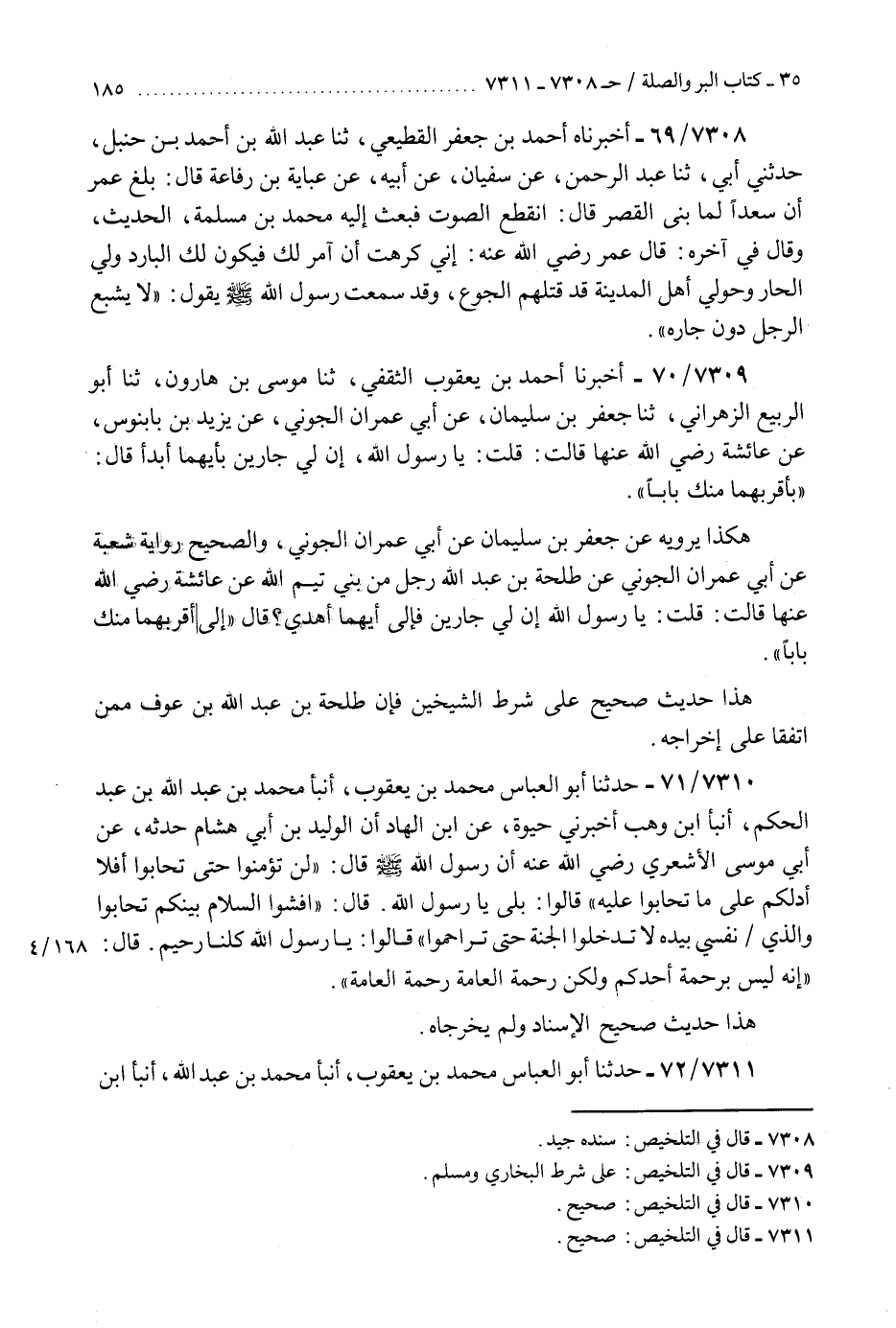 7310 - حَدَّثَنَا أَبُو الْعَبَّاسِ مُحَمَّدُ بْنُ يَعْقُوبَ، أَنْبَأَ مُحَمَّدُ بْنُ عَبْدِ اللَّهِ بْنِ عَبْدِ الْحَكَمِ، أَنْبَأَ ابْنُ وَهْبٍ، أَخْبَرَنِي حَيْوَةُ، عَنِ ابْنِ الْهَادِ، أَنَّ الْوَلِيدَ بْنَ أَبِي هِشَامٍ، حَدَّثَهُ عَنْ أَبِي مُوسَى الْأَشْعَرِيِّ، رَضِيَ اللَّهُ عَنْهُ أَنَّ رَسُولَ اللَّهِ صَلَّى اللهُ عَلَيْهِ وَسَلَّمَ قَالَ: §«لَنْ تُؤْمِنُوا حَتَّى تَحَابُّوا أَفَلَا أَدُلُّكُمْ عَلَى مَا تَحَابُّوا عَلَيْهِ؟» قَالُوا: بَلَى يَا رَسُولَ اللَّهِ. قَالَ: «أَفْشُوا السَّلَامَ بَيْنَكُمْ تَحَابُّوا، وَالَّذِي نَفْسِي بِيَدِهِ لَا تَدْخُلُوا الْجَنَّةَ حَتَّى تَرَاحَمُوا» قَالُوا: يَا رَسُولَ اللَّهِ كُلُّنَا رَحِيمٌ. قَالَ: «إِنَّهُ لَيْسَ بِرَحْمَةِ أَحَدِكُمْ وَلَكِنْ رَحْمَةُ الْعَامَّةِ رَحْمَةُ الْعَامَّةِ» هَذَا حَدِيثٌ صَحِيحُ الْإِسْنَادِ وَلَمْ يُخَرِّجَاهُ "K7310 - صحيح
