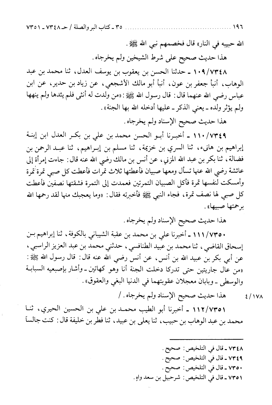 7351 - أَخْبَرَنَا أَبُو الطَّيِّبِ مُحَمَّدُ بْنُ عَلِيِّ بْنُ الْحُسَيْنِ الْحِيرِيُّ، ثَنَا مُحَمَّدُ بْنُ عَبْدِ الْوَهَّابِ بْنِ حَبِيبٍ، ثَنَا يَعْلَى بْنُ عُبَيْدٍ، ثَنَا فِطْرُ بْنُ خَلِيفَةَ، قَالَ: كُنْتُ جَالِسًا عِنْدَ زَيْدِ بْنِ عَلِيٍّ رَضِيَ اللَّهُ عَنْهُ بِالْمَدِينَةِ فَمَرَّ عَلَيْهِ شَيْخٌ يُقَالُ لَهُ شُرَحْبِيلُ أَبُو سَعْدٍ، فَقَالَ لَهُ زَيْدٌ: مِنْ أَيْنَ جِئْتَ يَا أَبَا سَعْدٍ؟ قَالَ: مِنْ عِنْدَ أَمِيرِ الْمَدِينَةِ حَدَّثَتْهُ بِحَدِيثٍ قَالَ: فَحَدِّثْ بِهِ الْقَوْمَ، قَالَ: سَمِعْتُ ابْنَ عَبَّاسٍ، رَضِيَ اللَّهُ عَنْهُمَا يَقُولُ: قَالَ رَسُولُ اللَّهِ صَلَّى اللهُ عَلَيْهِ وَسَلَّمَ: §«مَا مِنْ مُسْلِمٍ تُدْرَكُ لَهُ ابْنَتَانِ فَيُحْسِنُ إِلَيْهِمَا مَا صَحِبَتَاهُ أَوْ صَحِبَهُمَا إِلَّا أَدْخَلَتَاهُ الْجَنَّةَ» هَذَا حَدِيثٌ صَحِيحُ الْإِسْنَادِ وَلَمْ يُخَرِّجَاهُ "