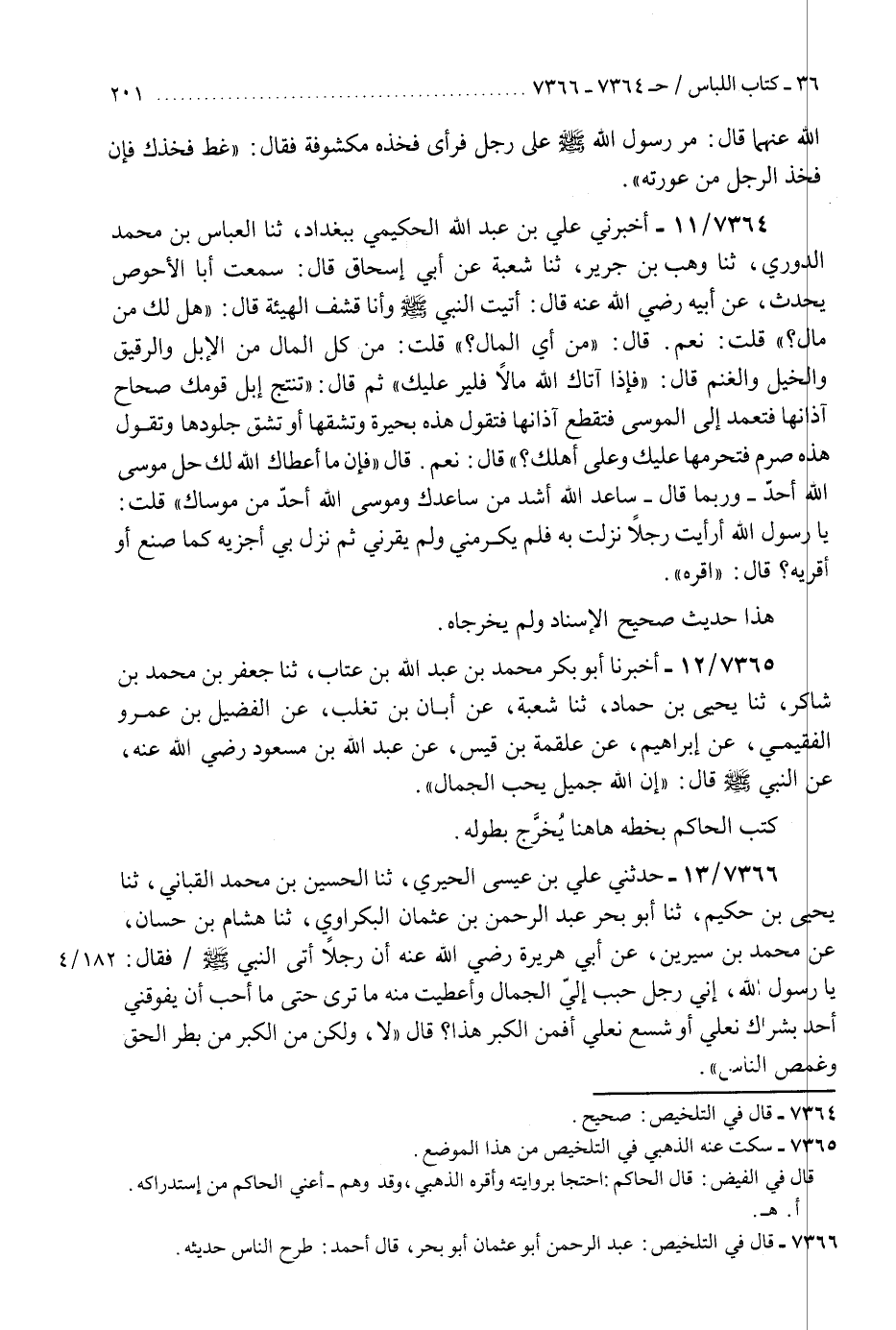 7365 - أَخْبَرَنَا أَبُو بَكْرٍ مُحَمَّدُ بْنُ عَبْدِ اللَّهِ بْنِ عَتَّابٍ، ثَنَا جَعْفَرُ بْنُ مُحَمَّدِ بْنِ شَاكِرٍ، ثَنَا يَحْيَى بْنُ حَمَّادٍ، ثَنَا شُعْبَةُ، عَنْ أَبَانَ بْنِ تَغْلِبَ، عَنِ الْفُضَيْلِ بْنِ عَمْرٍو الْفُقَيْمِيِّ، عَنْ إِبْرَاهِيمَ، عَنْ عَلْقَمَةَ بْنِ قَيْسٍ، عَنْ عَبْدِ اللَّهِ بْنِ مَسْعُودٍ، رَضِيَ اللَّهُ عَنْهُ، عَنِ النَّبِيِّ صَلَّى اللهُ عَلَيْهِ وَسَلَّمَ قَالَ: «إِنَّ §اللَّهَ جَمِيلٌ يُحِبُّ الْجَمَالَ» كَتَبَ الْحَاكِمُ بِخَطِّهِ: «هَاهُنَا يُخَرَّجُ بِطُولِهِ» K7365 - سكت عنه الذهبي في التلخيص من هذا الموضع