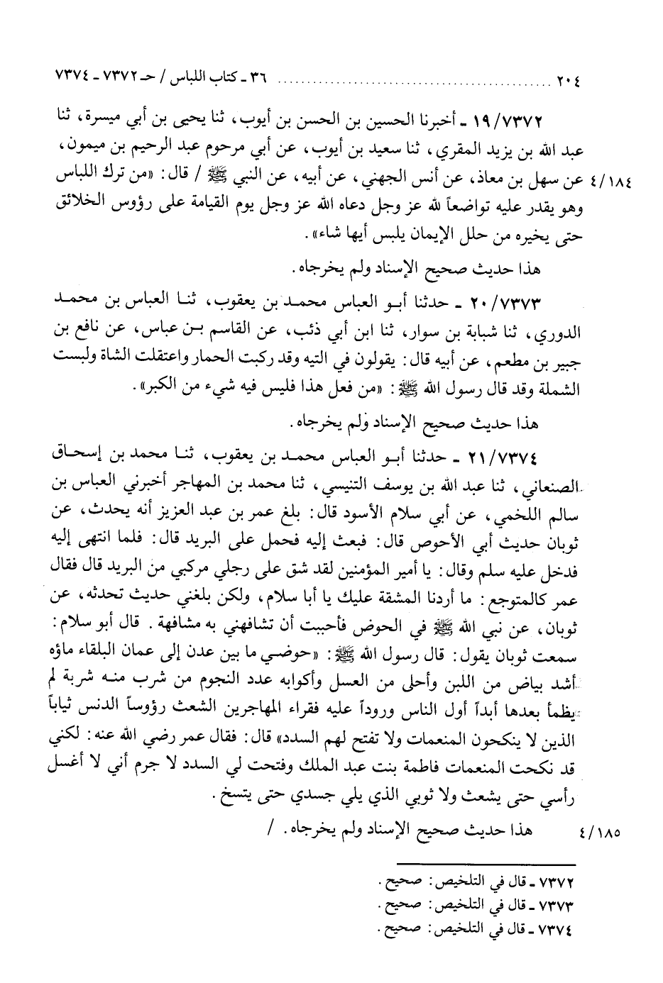7374 - حَدَّثَنَا أَبُو الْعَبَّاسِ مُحَمَّدُ بْنُ يَعْقُوبَ، ثَنَا مُحَمَّدُ بْنُ إِسْحَاقَ الصَّنْعَانِيُّ، ثَنَا عَبْدُ اللَّهِ بْنُ يُوسُفَ التِّنِّيسِيُّ، ثَنَا مُحَمَّدُ بْنُ الْمُهَاجِرِ، أَخْبَرَنِي الْعَبَّاسُ بْنُ سَالِمٍ اللَّخْمِيُّ، عَنْ أَبِي سَلَّامٍ الْأَسْوَدِ، قَالَ: بَلَغَ عُمَرَ بْنَ عَبْدِ الْعَزِيزِ أَنَّهُ يُحَدَّثُ عَنْ ثَوْبَانَ حَدِيثُ أَبِي الْأَحْوَصِ، قَالَ: فَبَعَثَ إِلَيْهِ فَحُمِلَ عَلَى الْبَرِيدِ قَالَ: فَلَمَّا انْتَهَى إِلَيْهِ فَدَخَلَ عَلَيْهِ سَلَّمَ وَقَالَ: يَا أَمِيرَ الْمُؤْمِنِينَ لَقَدْ شَقَّ عَلَى رِجْلِي مَرْكَبِي مِنَ الْبَرِيدِ قَالَ: فَقَالَ عُمَرُ كَالْمُتَوَجِّعِ: مَا أَرَدْنَا الْمَشَقَّةَ عَلَيْكَ يَا أَبَا سَلَّامٍ، وَلَكِنْ بَلَغَنِي حَدِيثٌ تُحَدِّثُهُ، عَنْ ثَوْبَانَ، عَنْ نَبِيِّ اللَّهِ صَلَّى اللهُ عَلَيْهِ وَسَلَّمَ فِي الْحَوْضِ فَأَحْبَبْتُ أَنْ تُشَافِهَنِي بِهِ مُشَافَهَةً. قَالَ أَبُو سَلَّامٍ: سَمِعْتُ ثَوْبَانَ، يَقُولُ: قَالَ رَسُولُ اللَّهِ صَلَّى اللهُ عَلَيْهِ وَسَلَّمَ: §«حَوْضِي مَا بَيْنَ عَدَنٍ إِلَى عُمَانَ الْبَلْقَاءِ مَاؤُهُ أَشَدُّ بَيَاضًا مِنَ اللَّبَنِ وَأَحْلَى مِنَ الْعَسَلِ وَأَكْوَابُهُ عَدَدُ النُّجُومِ مَنْ شَرِبَ مِنْهُ شَرْبَةً لَمْ يَظْمَأْ بَعْدَهَا أَبَدًا أَوَّلُ النَّاسِ وُرُودًا عَلَيْهِ فُقَرَاءُ الْمُهَاجِرِينِ الشُّعْثُ رُءُوسًا الدُّنْسُ ثِيَابًا الَّذِينَ لَا يَنْكِحُونَ الْمُنَعَّمَاتِ وَلَا تُفْتَحُ لَهُمُ السُّدَدُ» قَالَ: فَقَالَ عُمَرُ رَضِيَ اللَّهُ عَنْهُ: «لَكِنِّي قَدْ نَكَحْتُ الْمُنَعَّمَاتِ فَاطِمَةَ بِنْتَ عَبْدِ الْمَلِكِ وَفُتِحَتْ لِي السُّدَدُ لَا جَرَمَ أَنِّي لَا أَغْسِلُ رَأْسِي حَتَّى يَشْعَثَ وَلَا ثَوْبِيَ الَّذِي يَلِي جَسَدِي حَتَّى يَتَّسِخَ» هَذَا حَدِيثٌ صَحِيحُ الْإِسْنَادِ وَلَمْ يُخَرِّجَاهُ "K7374 - صحيح