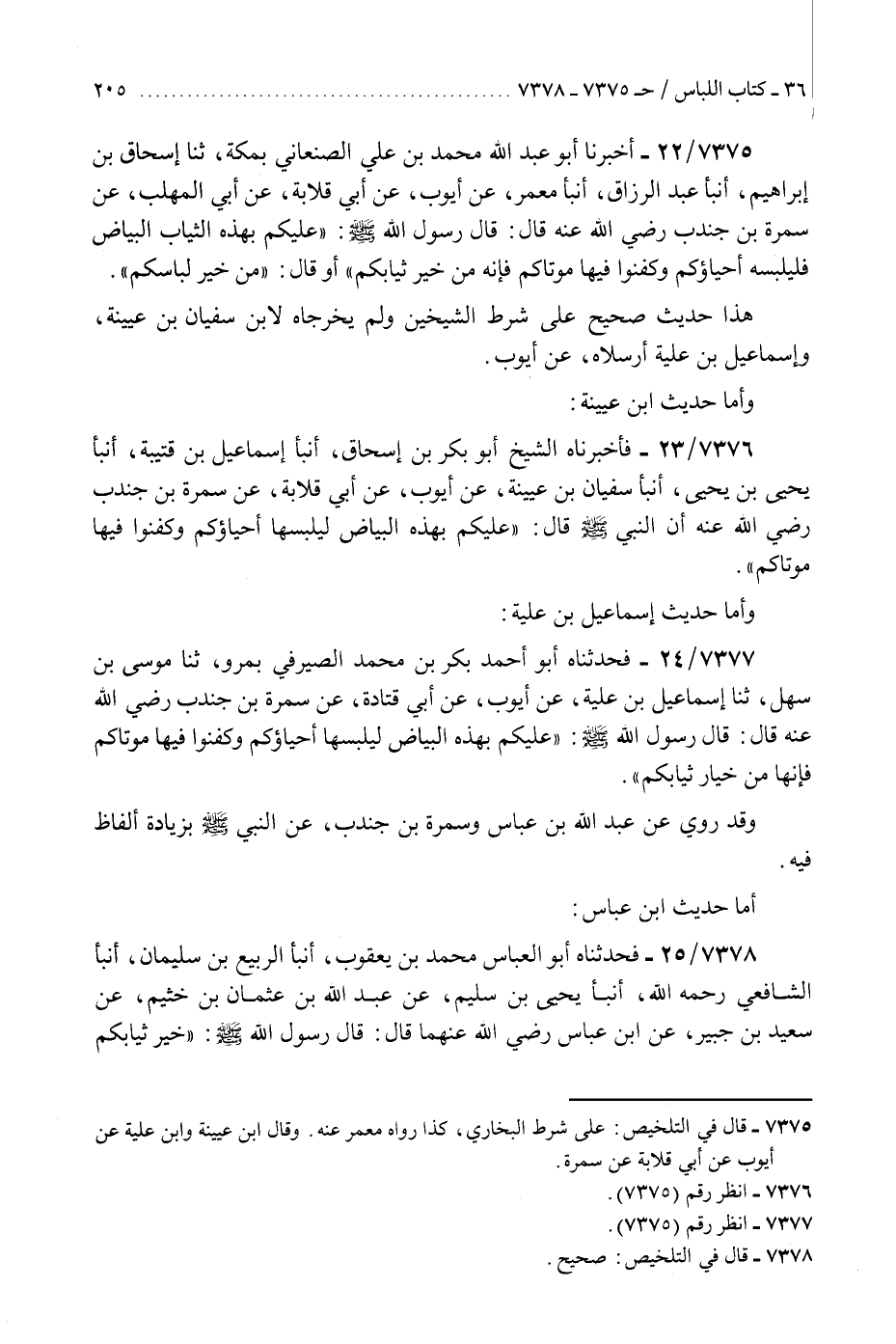 7376 - فَأَخْبَرَنَاهُ الشَّيْخُ أَبُو بَكْرِ بْنُ إِسْحَاقَ، أَنْبَأَ إِسْمَاعِيلُ بْنُ قُتَيْبَةَ، أَنْبَأَ يَحْيَى بْنُ يَحْيَى، أَنْبَأَ سُفْيَانُ بْنُ عُيَيْنَةَ، عَنْ أَيُّوبَ، عَنْ أَبِي قِلَابَةَ، عَنْ سَمُرَةَ بْنِ جُنْدُبٍ، رَضِيَ اللَّهُ عَنْهُ أَنَّ النَّبِيَّ صَلَّى اللهُ عَلَيْهِ وَسَلَّمَ قَالَ: §«عَلَيْكُمْ بِهَذِهِ الْبَيَاضِ لِيَلْبَسْهَا أَحْيَاؤُكُمْ وَكَفِّنُوا فِيهَا مَوْتَاكُمْ»