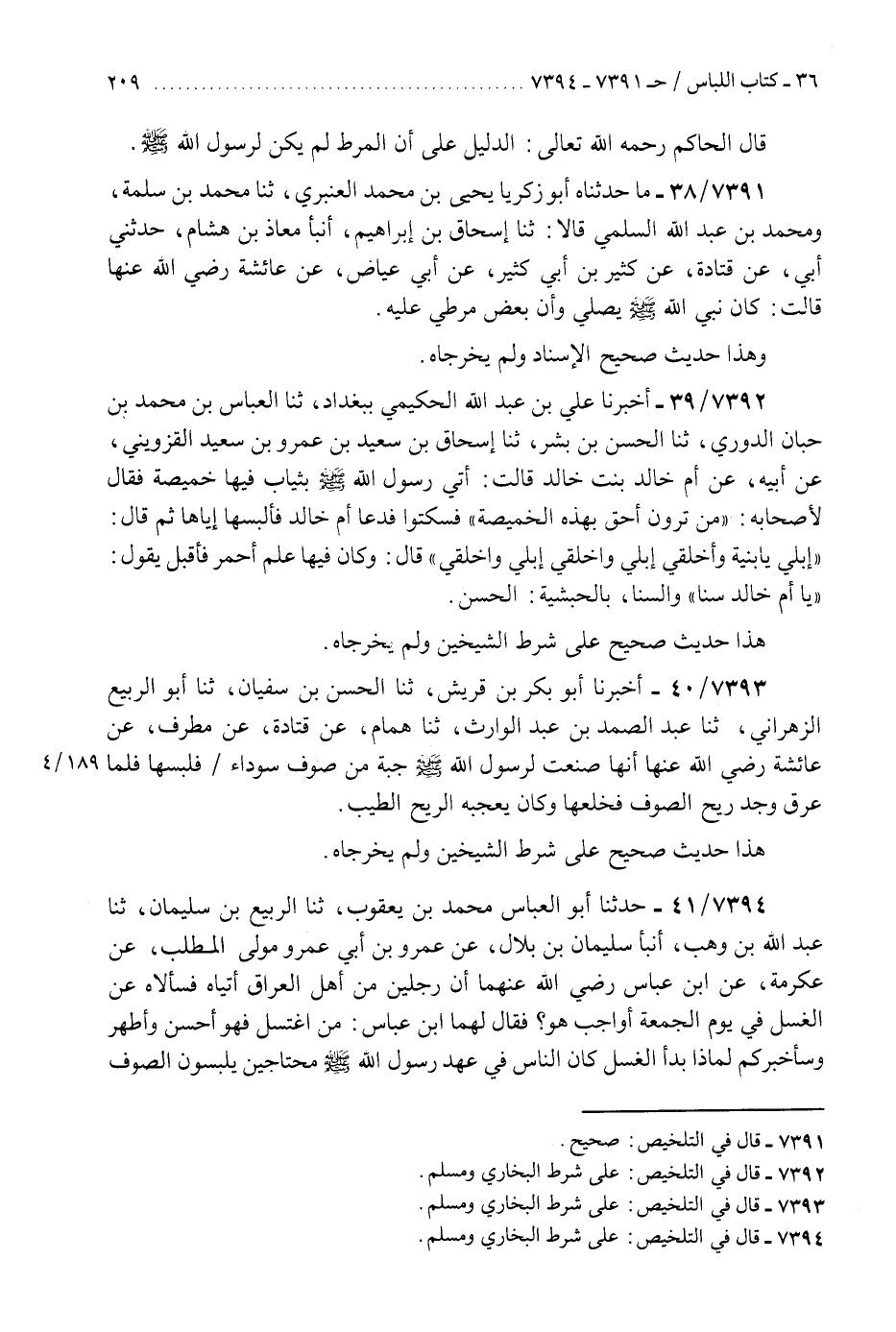 7395 - حَدَّثَنَا عَلِيُّ بْنُ حَمْشَاذَ الْعَدْلُ، ثَنَا مُوسَى بْنُ هَارُونَ، ثَنَا مُصْعَبُ بْنُ عَبْدِ اللَّهِ بْنِ مُصْعَبٍ، حَدَّثَنِي أَبِي، عَنْ إِسْمَاعِيلَ بْنِ عَبْدِ اللَّهِ بْنِ جَعْفَرٍ، عَنْ أَبِيهِ، رَضِيَ اللَّهُ عَنْهُ قَالَ: «رَأَيْتُ رَسُولَ اللَّهِ صَلَّى اللهُ عَلَيْهِ وَسَلَّمَ §وَعَلَيْهِ ثَوْبَانِ مَصْبُوغَانِ بِالزَّعْفَرَانِ رِدَاءٌ وَعِمَامَةٌ» هَذَا حَدِيثٌ صَحِيحٌ عَلَى شَرْطِ الشَّيْخَيْنِ وَلَمْ يُخَرِّجَاهُ "K7395 - ليس على شرط أي أحد منهما