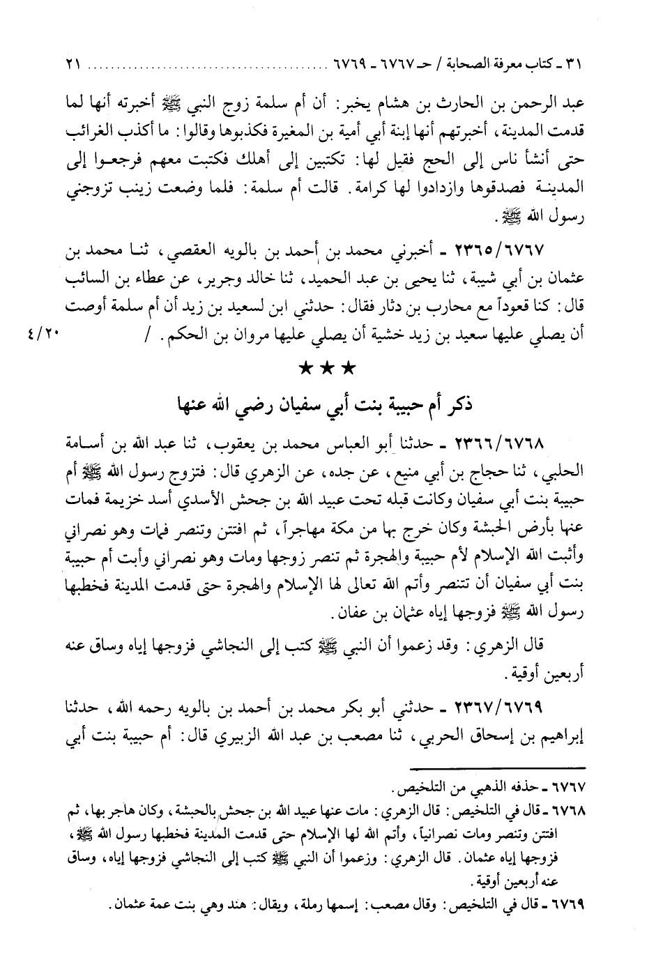 6769 - حَدَّثَنِي أَبُو بَكْرٍ مُحَمَّدُ بْنُ أَحْمَدَ بْنِ بَالَوَيْهِ رَحِمَهُ اللَّهُ، حَدَّثَنَا إِبْرَاهِيمُ بْنُ إِسْحَاقَ الْحَرْبِيُّ، ثنا مُصْعَبُ بْنُ عَبْدِ اللَّهِ الزُّبَيْرِيُّ، قَالَ: §" أُمُّ حَبِيبَةَ بِنْتُ أَبِي سُفْيَانَ بْنِ حَرْبٍ اسْمُهَا رَمْلَةُ بِنْتُ أَبِي سُفْيَانَ، وَيُقَالُ: اسْمُهَا هِنْدٌ وَالْمَشْهُورُ رَمْلَةُ، وَأُمُّهَا صَفِيَّةُ بِنْتُ أَبِي الْعَاصِ بْنِ أُمَيَّةَ، وَيُقَالُ: آمِنَةُ بِنْتُ عَبْدِ الْعُزَّى بْنِ حَرْبَانَ بْنِ عَوْفِ بْنِ عُبَيْدِ بْنِ عُوَيْجِ بْنِ عَدِيِّ بْنِ كَعْبٍ وَتُوُفِّيَتْ قَبْلَ مُعَاوِيَةَ بِسَنَةٍ "