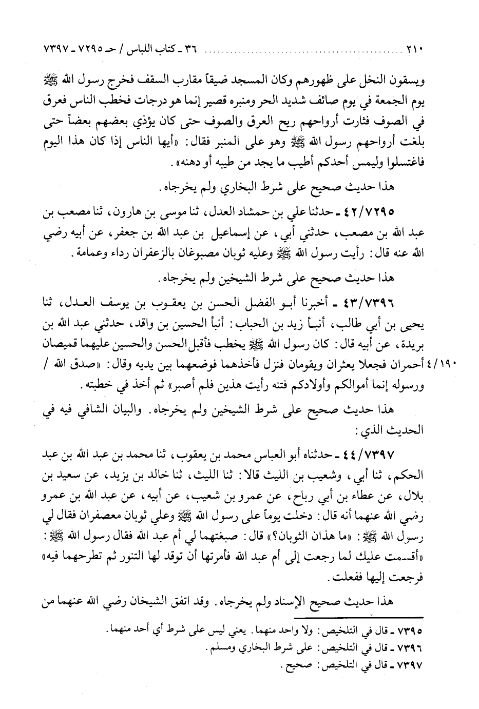 7397 - حَدَّثَنَاهُ أَبُو الْعَبَّاسِ مُحَمَّدُ بْنُ يَعْقُوبَ، ثَنَا مُحَمَّدُ بْنُ عَبْدِ اللَّهِ بْنِ عَبْدِ الْحَكَمِ، ثَنَا أَبِي، وَشُعَيْبُ بْنُ اللَّيْثِ، قَالَا: ثَنَا اللَّيْثُ، ثَنَا خَالِدُ بْنُ يَزِيدَ، عَنْ سَعِيدِ بْنِ بِلَالٍ، عَنْ عَطَاءِ بْنِ أَبِي رَبَاحٍ، عَنْ عَمْرِو بْنِ شُعَيْبٍ، عَنْ أَبِيهِ، عَنْ عَبْدِ اللَّهِ بْنِ عَمْرٍو، رَضِيَ اللَّهُ عَنْهُمَا أَنَّهُ قَالَ: دَخَلْتُ يَوْمًا عَلَى رَسُولِ اللَّهِ صَلَّى اللهُ عَلَيْهِ وَسَلَّمَ وَعَلَيَّ ثَوْبَانِ مُعَصْفَرَانِ فَقَالَ لِي رَسُولُ اللَّهِ صَلَّى اللهُ عَلَيْهِ وَسَلَّمَ: «مَا هَذَانِ الثَّوْبَانِ؟» قَالَ: صَبَغَتْهُمَا لِي أُمُّ عَبْدِ اللَّهِ فَقَالَ رَسُولُ اللَّهِ صَلَّى اللهُ عَلَيْهِ وَسَلَّمَ: §«أَقْسَمْتُ عَلَيْكَ لَمَا رَجَعْتَ إِلَى أُمِّ عَبْدِ اللَّهِ فَأَمَرْتَهَا أَنْ تُوقِدَ لَهَا التَّنُّورَ ثُمَّ تَطَرْحُهُمَا فِيهِ» فَرَجَعْتُ إِلَيْهَا فَفَعَلْتُ «هَذَا حَدِيثٌ صَحِيحُ الْإِسْنَادِ وَلَمْ يُخَرِّجَاهُ» وَقَدِ اتَّفَقَ الشَّيْخَانِ رَضِيَ اللَّهُ عَنْهُمَا مِنَ النَّهْيِ عَنْ لُبْسِ الْمُعَصْفَرِ لِلرَّجُلِ عَلَى حَدِيثِ عَلِيٍّ رَضِيَ اللَّهُ عَنْهُ وَفِيهِ نَهَانِي النَّبِيُّ صَلَّى اللهُ عَلَيْهِ وَسَلَّمَ وَلَا أَقُولُ نَهَاكُمْ "K7397 - صحيح
